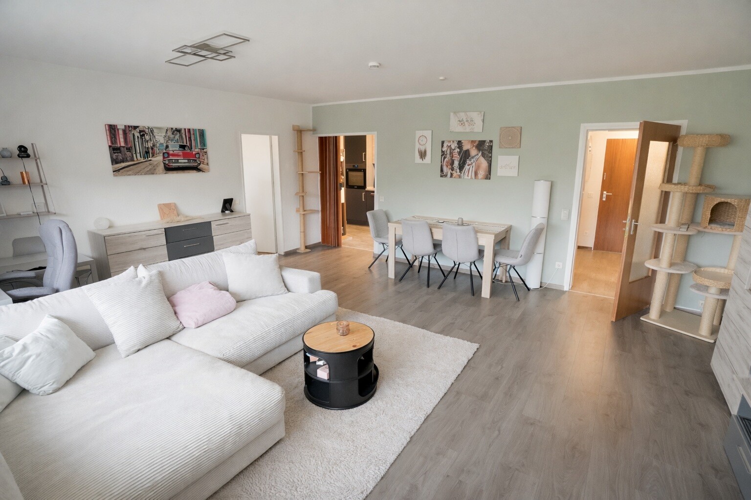 Bodenbeläge: Eingangsdiele, Wohnbereich, Küche undBadezimmer moderner Klick-Vinylboden, Schlafzimmer Laminat