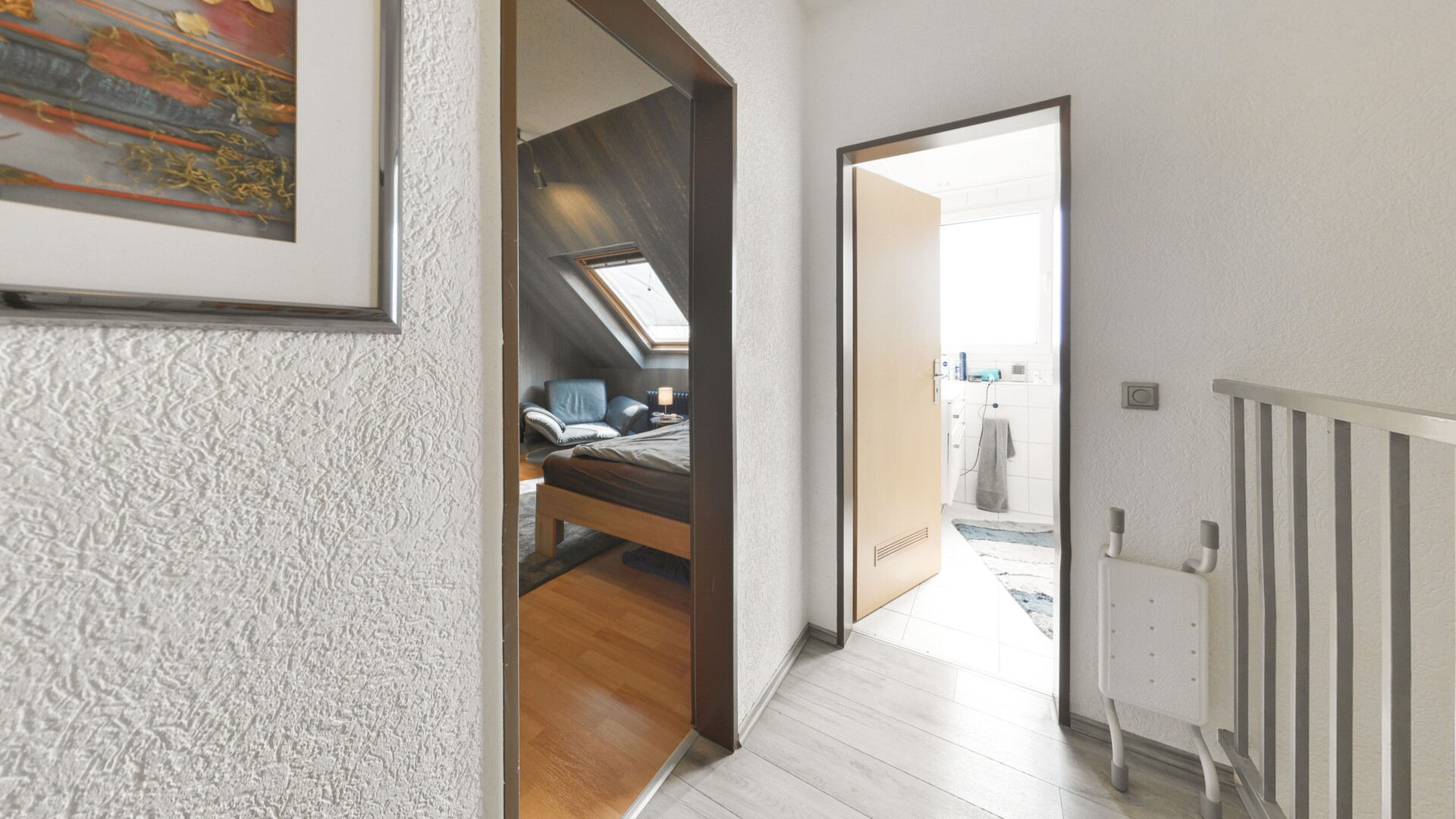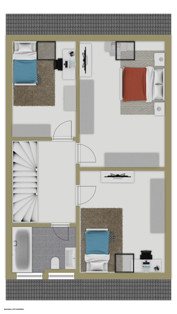 Das Obergeschoss verteilt sich auf drei wohlproportionierte Zimmer, die sich flexibel als Master-Bedroom, Kinderzimmer oder ruhiges Homeoffice in den Alltag integrieren lassen. Ein tagesbelichtetes Badezimmer mit Badewanne vervollständigt das Raumangebot dieser Etage. Zusätzlichen Komfort bietet das Teiluntergeschoss mit separaten Flächen für Vorräte sowie einer dedizierten Waschküche, die den Wohnbereich wirksam entlastet.
