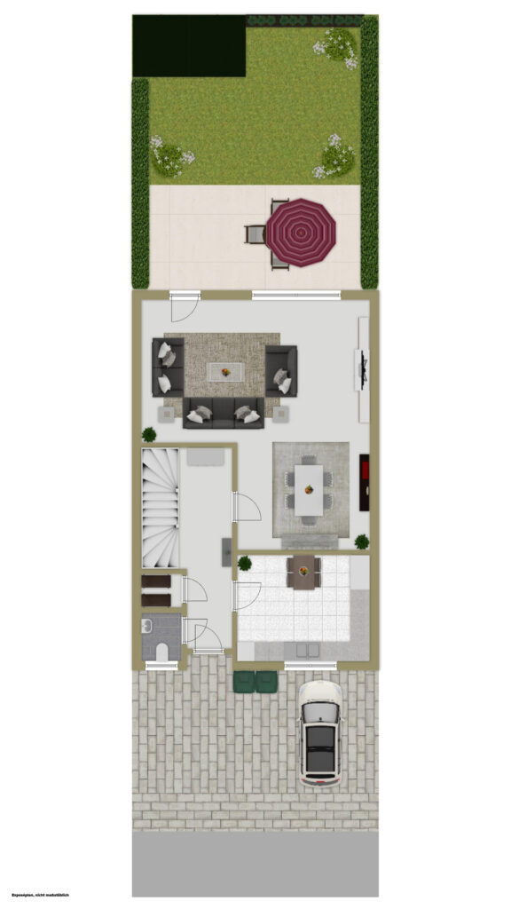 Ein besonderes Highlight ist die Außenanlage. Der Garten in Nord-West-Ausrichtung fängt die goldene Abendsonne ein und lädt dazu ein, den Feierabend bei entspannten Stunden auf der Terrasse ausklingen zu lassen. Während die Nord-Komponente im Hochsommer für eine angenehme Grundkühle sorgt, garantiert die West-Ausrichtung maximale Helligkeit bis in die späten Stunden.