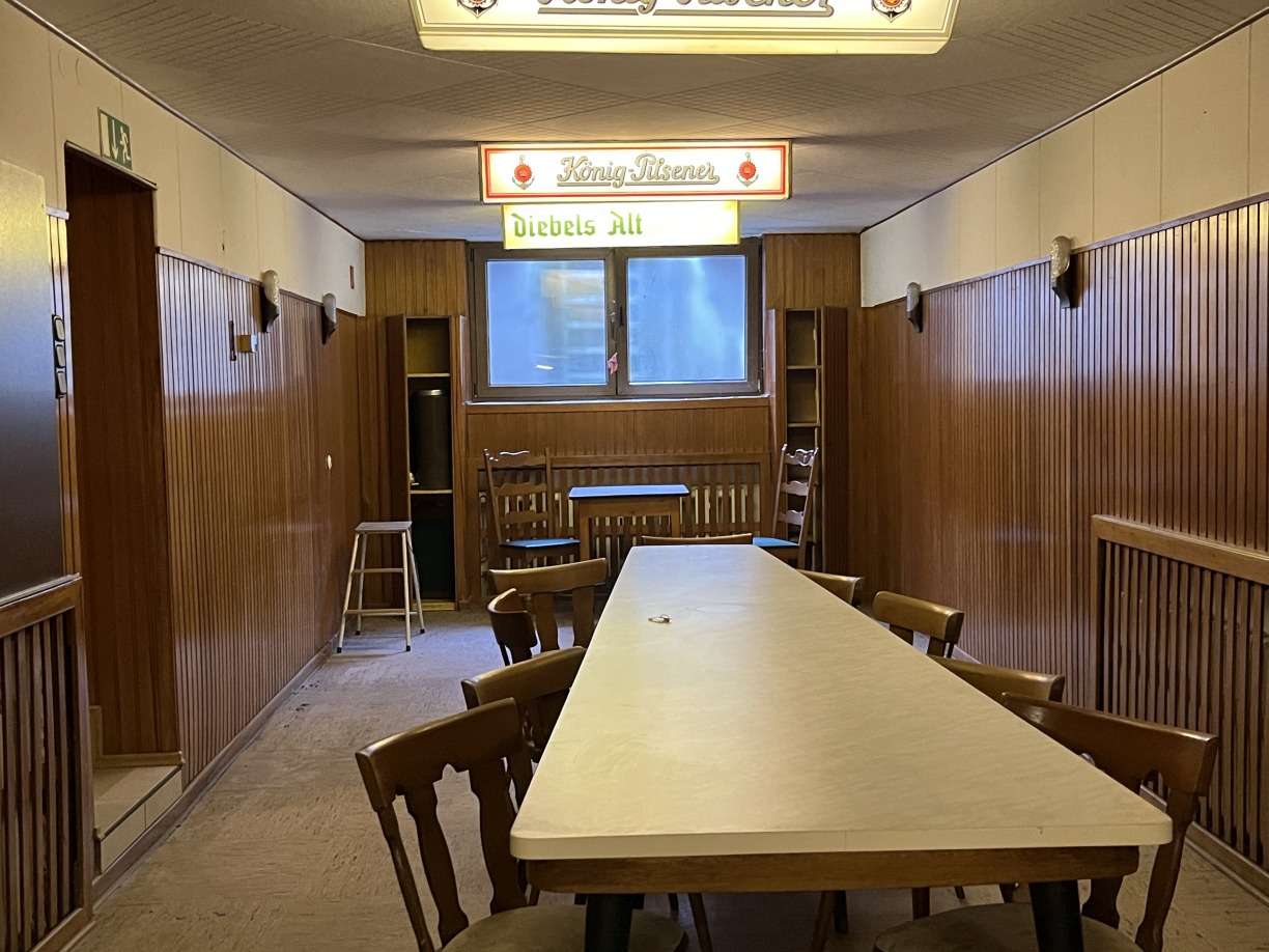 Der einseitig angebaute Baukörper verfügt über ein ausgebautes Satteldach und einen zweigeschossigen Anbau mit Flachdach und ist voll unterkellert. Im Erdgeschoss befindet sich die ehemalige Gaststätte (ca. 86 m²) mit großem Gastraum, Küche, getrennten WCs und direktem Zugang zu Terrasse und Garten. Das Obergeschoss bietet eine helle 3-Zimmer-Wohnung (ca. 90 m2) mit Balkon, Wohn- und Essbereich, Schlafzimmer, Kinder- oder Arbeitszimmer, Küche und Bad. Im Keller lädt eine Kegelbahn zur Freizeitgestaltung ein. Zusätzlich gibt es einen massiv errichteten Abstellschuppen mit zwei Räumen und Toiletten, einen Carport für mehrere Fahrzeuge sowie weitere Stellplätze vor dem Haus. Ideal für Wohnen, Arbeiten oder Freizeit, ein Objekt mit vielfältigen Möglichkeiten.