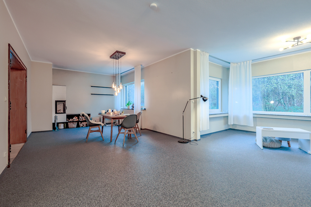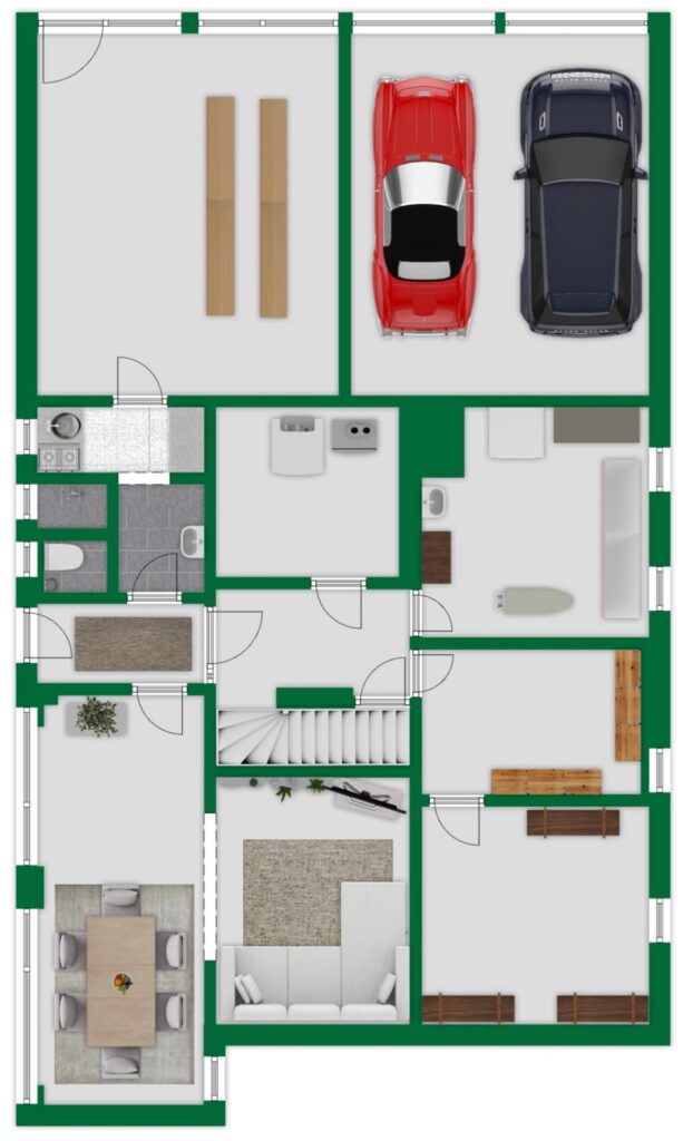 Durch die Hanglage ist das Gebäude in ein Gartengeschoss, ein Erdgeschoss auf Straßenniveau sowie ein Obergeschoss gegliedert. Das Gartengeschoss öffnet sich ebenerdig zum Garten und bietet einen großen Raum, der sich ideal als Büro, Hobbyraum oder Gästezimmer eignet. Ergänzt wird diese Ebene durch ein WC, eine Dusche und eine Kochnische. Ein weiterer Raum entstand durch die Umnutzung einer ehemaligen Garage und wurde mit einer großzügigen Fensterfront und Tür ausgestattet. Zusätzlich befinden sich auf dieser Ebene zwei Garagen, ein Heizungskeller, eine Waschküche, zwei Abstellräume sowie ein Flur mit Treppe ins Erdgeschoss.