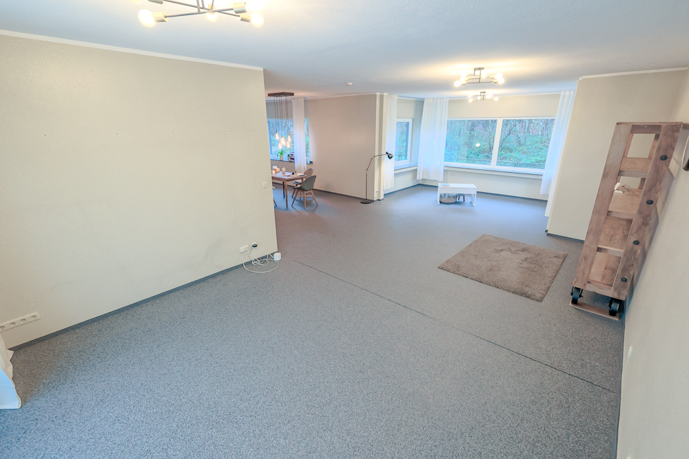 2021: Fußbodenheizung im Wohnzimmer, moderner Steinteppich, neuer Kaminofen