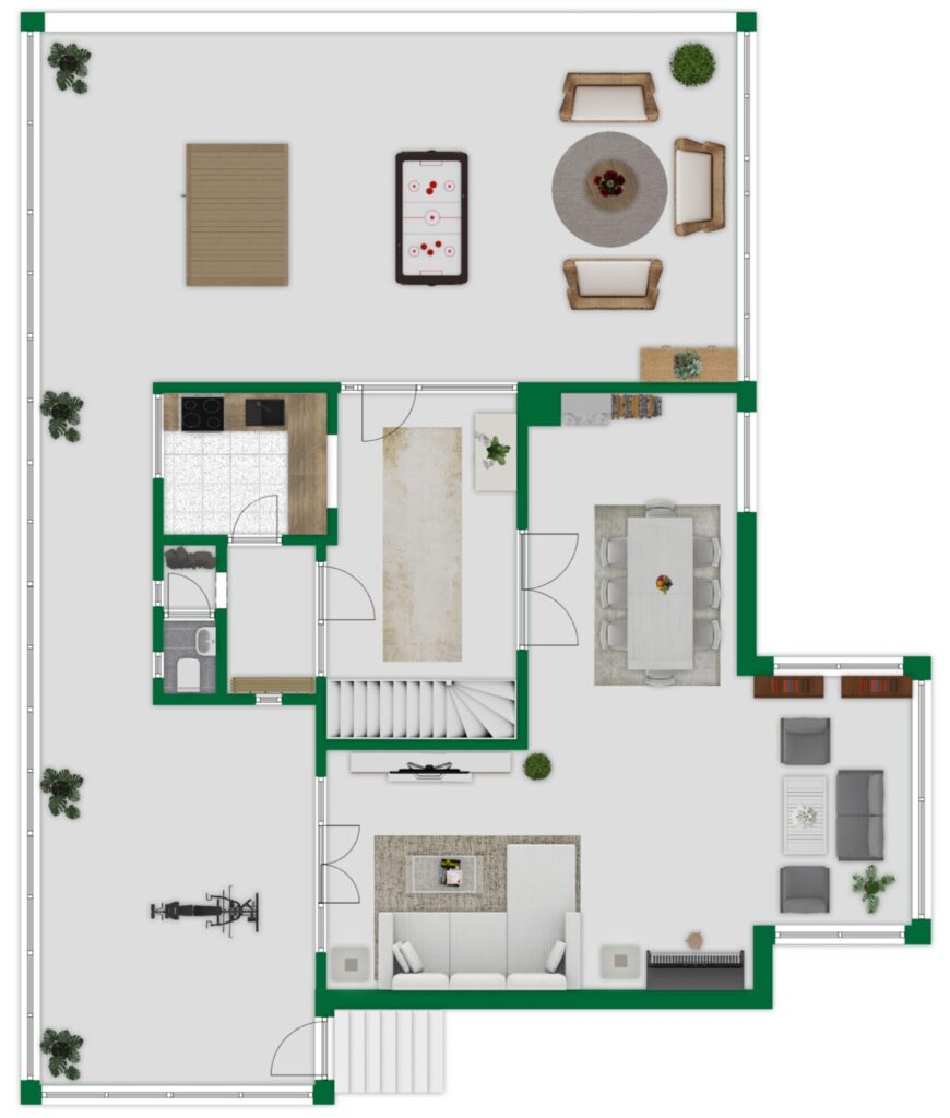 Die Terrassenflächen im Erdgeschoss umfassen insgesamt rund 120 m². Eine auf der Terrasse platzierte Fass-Sauna ist bereits im Kaufpreis enthalten und unterstreicht den besonderen Wohnkomfort.