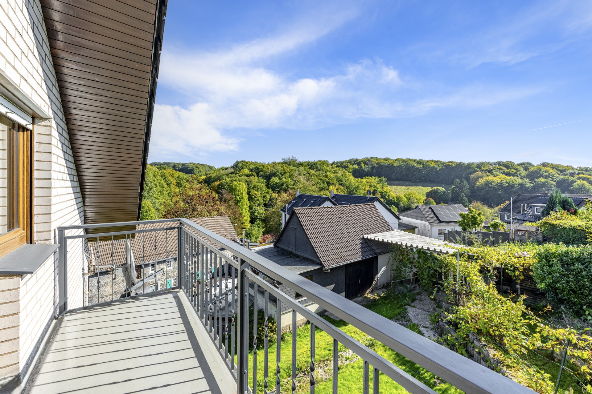 Im Erdgeschoss befinden sich zwei Zimmer, eine separate Küche, ein Badezimmer mit Dusche und WC sowie der Heizungs- und Öltankraum. Das Obergeschoss besticht durch einen rund 38qm großen lichtdurchfluteten Wohnbereich mit offener Küche und angrenzender Essdiele. Hier sorgt ein Kaminofen für behagliche Wärme und eine gemütliche Atmosphäre. Von der Essdiele gelangen Sie direkt auf die große Terrasse sowie in den Garten, in dem sich ein angebauter Wintergarten mit Außenkamin befindet – perfekt für gemütliche Abende und entspannte Stunden mit Blick ins Grüne. Ebenfalls auf dieser Ebene präsentieren sich ein Schlafzimmer, ein Badezimmer mit Badewanne und WC sowie ein praktischer Hauswirtschaftsraum mit Anschlussmöglichkeiten für Waschmaschine und Stauraum für Vorräte. Der großzügige Balkon, der sich über die Ost- und Südseite des Hauses erstreckt, ist von drei Räumen aus begehbar und bietet einen herrlichen Ausblick in die Natur. Über einen Treppenaufgang ausgehend von der Essdiele erreichen Sie das Dachgeschoss, das mit einem großzügigen Schlafzimmer mit eigenem Balkon, einem Kinderzimmer (ebenfalls mit Balkon) sowie zwei Tageslichtbädern (eines mit Wanne und zwei Waschtischen, eines mit Dusche und WC) überzeugt.