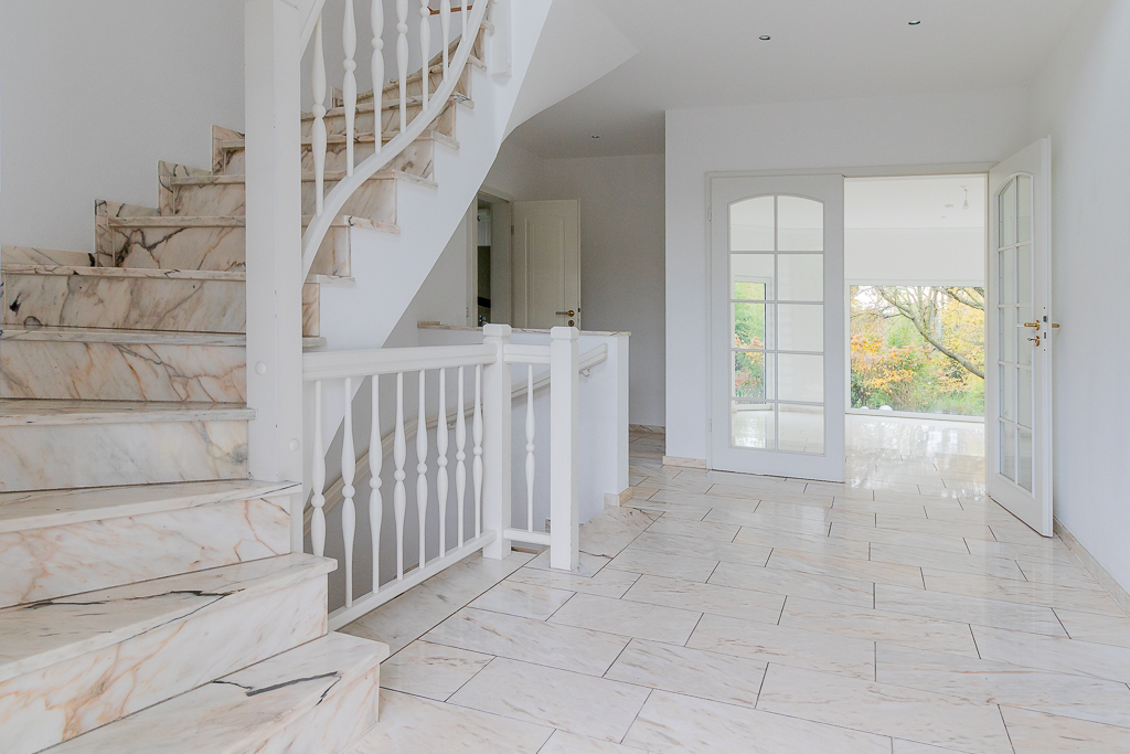 im Erdgeschoss und beide Treppen: heller, portugiesischer Marmor; Küche dunkle Granitfliesen. Laminat in den Schlafräumen und in der Diele im Obergeschoss; Vinylboden in den Wohnräumen im Untergeschoss