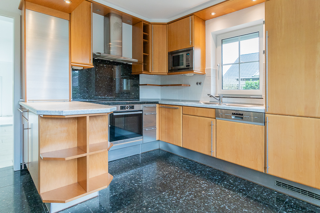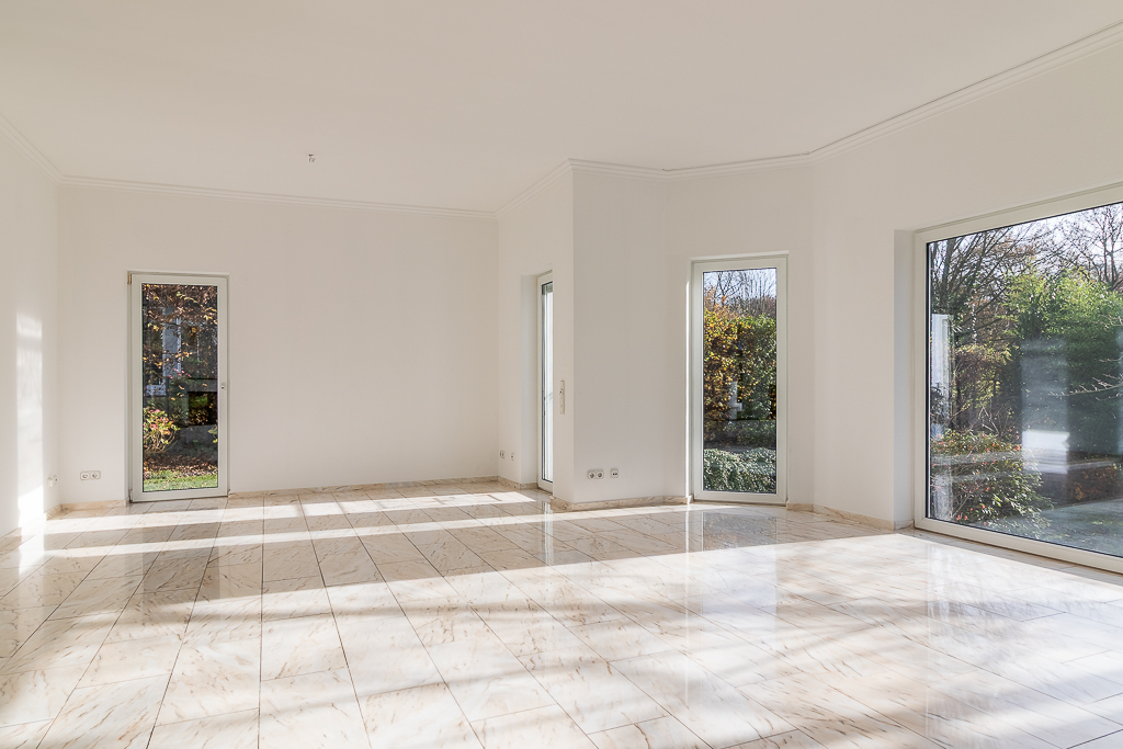 Beim Betreten des Erdgeschosses eröffnet sich eine großzügige Diele, die mit ihrer Geschosshöhe mit Blick auf die Galerie und den eleganten Marmorboden sofort beeindruckt. Durch eine doppelflügelige Holztüre mit Glaseinsatz eröffnet sich der Blick durch das großzügige Wohnzimmer hindurch hinaus in den Garten und das angrenzende Naturschutzgebiet. Die zahlreichen bodentiefen Fenster in Wohn- und Esszimmer tauchen den ganzen Bereich in ein warmes, natürliches Licht, während ein stilvoller Kamin angenehme Stunden der Gemütlichkeit verspricht. Das Wohnzimmer und das halb-offene angrenzende, geräumige Esszimmer sind ebenfalls mit Marmorboden ausgelegt. Die komplett ausgestattete Einbauküche bietet genug Platz und die perfekte Atmosphäre für gesellige Zusammenkünfte. Abgerundet wird das Erdgeschoss durch ein elegantes Gäste-WC, das mit hochwertigen Materialien überzeugt und den Komfort für Besucher unterstreicht.