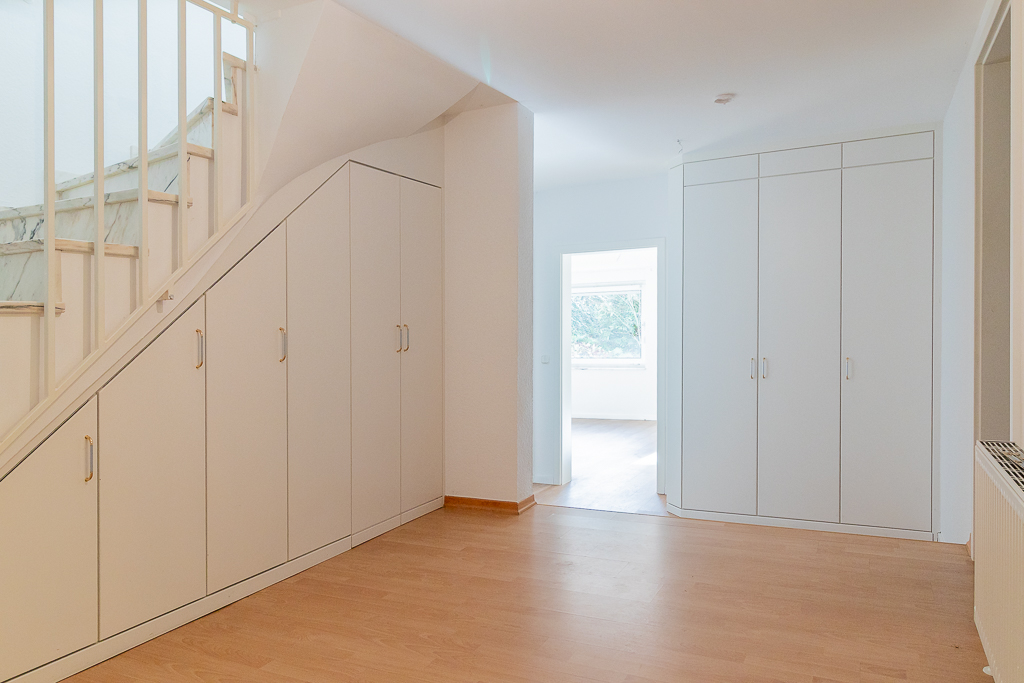 Der über eine Auszugstreppe erreichbare Dachboden ist mit seinen zwei Fenstern und Einbauschränken vollständig ausgebaut und bietet sich als Büro oder weiteres Spielzimmer an.