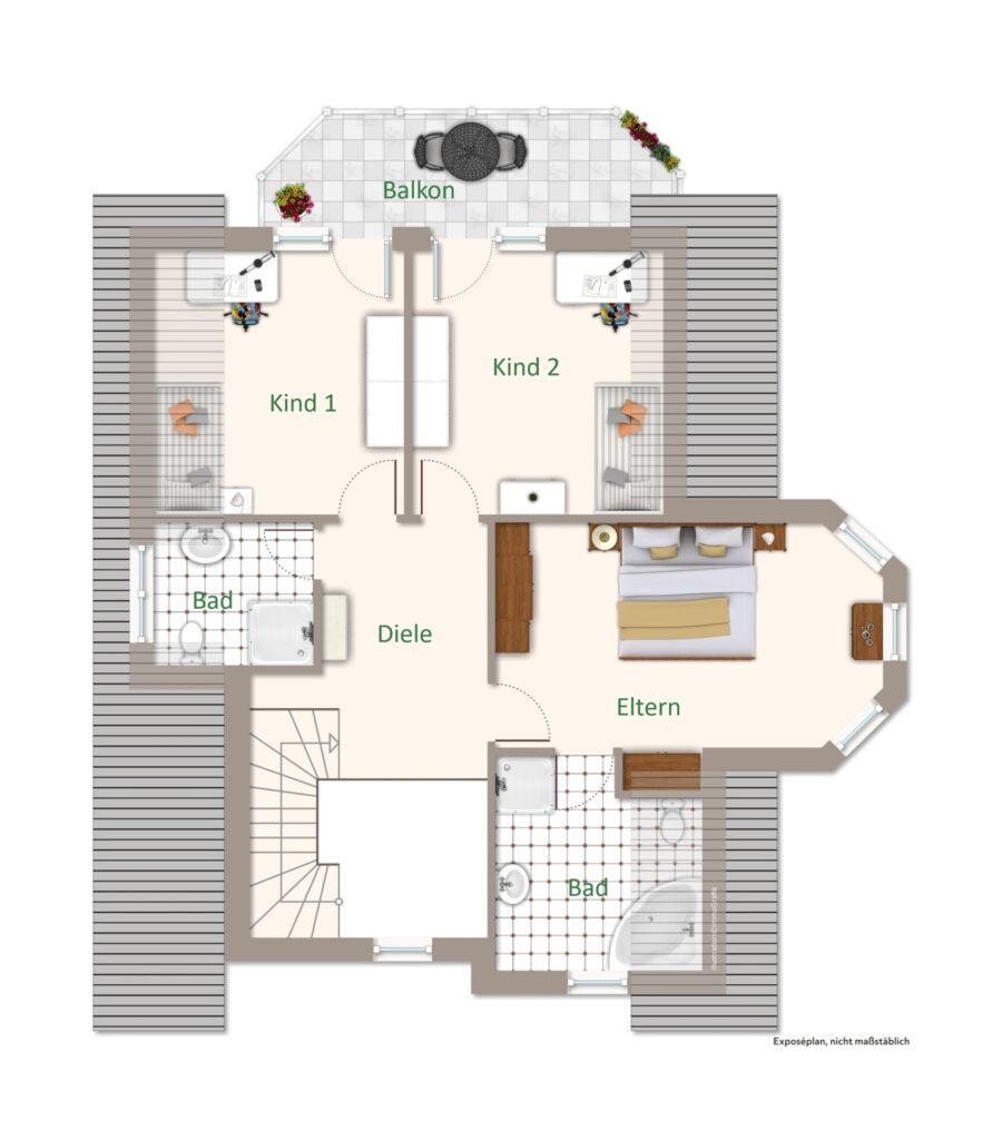 Über eine gewendelte Marmortreppe und eine Galerie wird im Obergeschoss das Elternschlafzimmer, welches mit großzügigen Einbauschränken ausgestattet ist, erreicht. Ein privater Rückzugsort mit en suite Badezimmer, das sowohl eine Dusche als auch eine Badewanne umfasst. Der vorhandene Wäscheschacht hinunter in die Waschküche erleichtert den Familienalltag. Auf dieser Etage warten des Weiteren zwei Kinderzimmer darauf, mit lebendigen Ideen und Kreativität gefüllt zu werden. Von beiden Zimmern wird der Balkon erreicht, mit Blick auf den Garten und die darüberhinausgehende Landschaft. Ein separates Duschbad für die beiden Kinderzimmer rundet diese Etage perfekt ab.