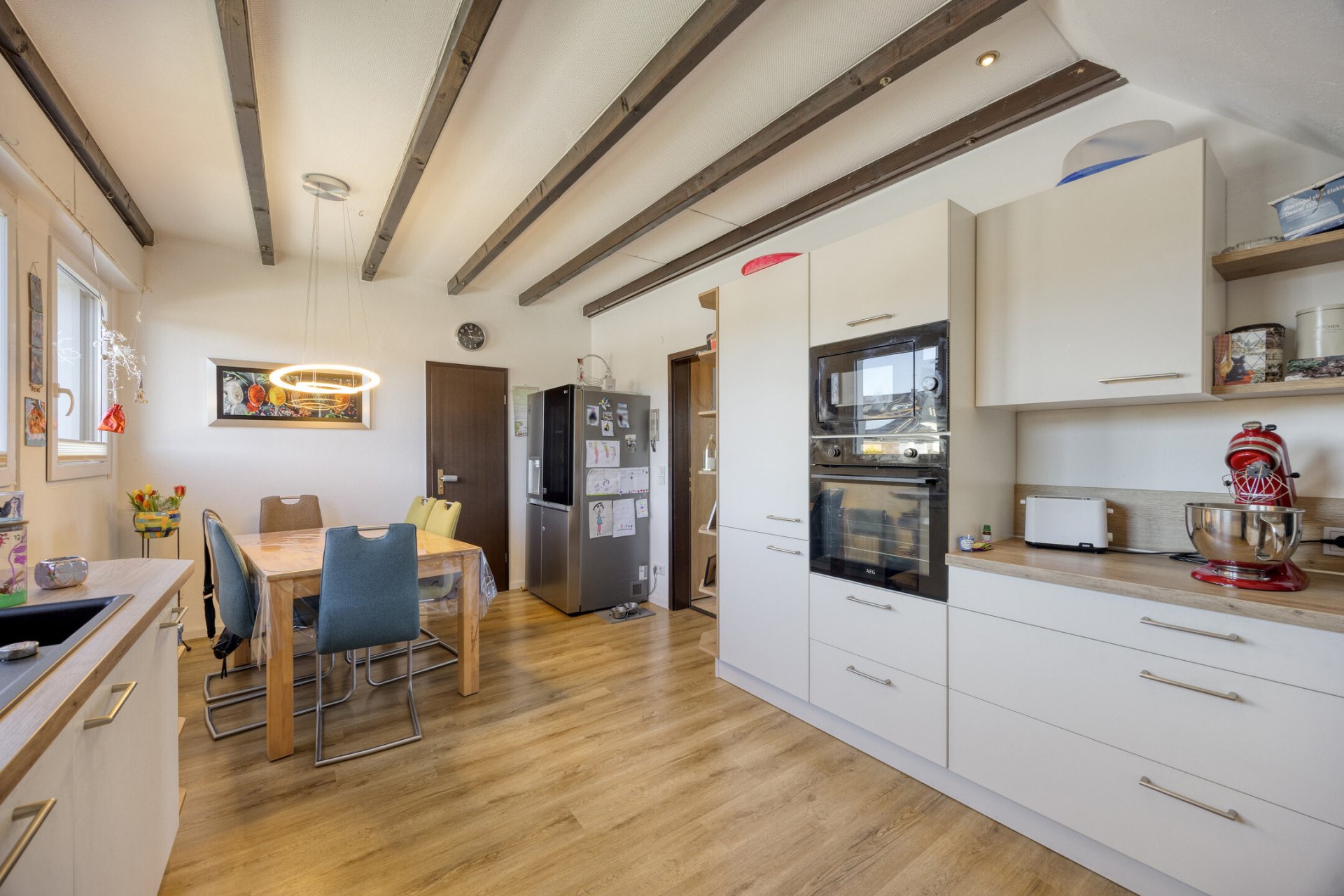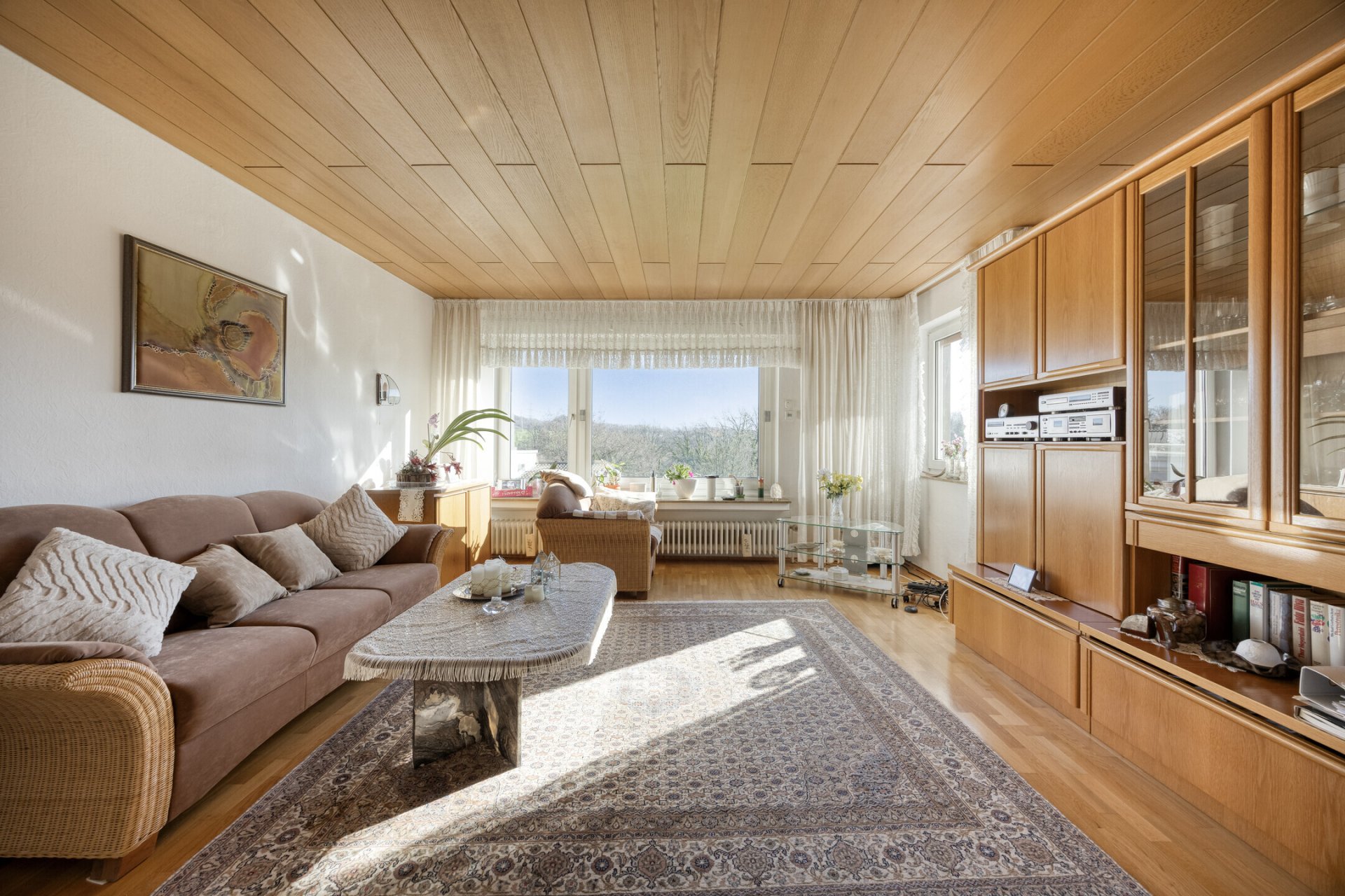 Besonders hervorzuheben ist der großzügige Wohnbereich im oberen Geschoss mit sichtbaren Holzbalken und Zugang zum Balkon. Von hier aus eröffnet sich ein weiter unverbaubarer Blick ins Grüne.