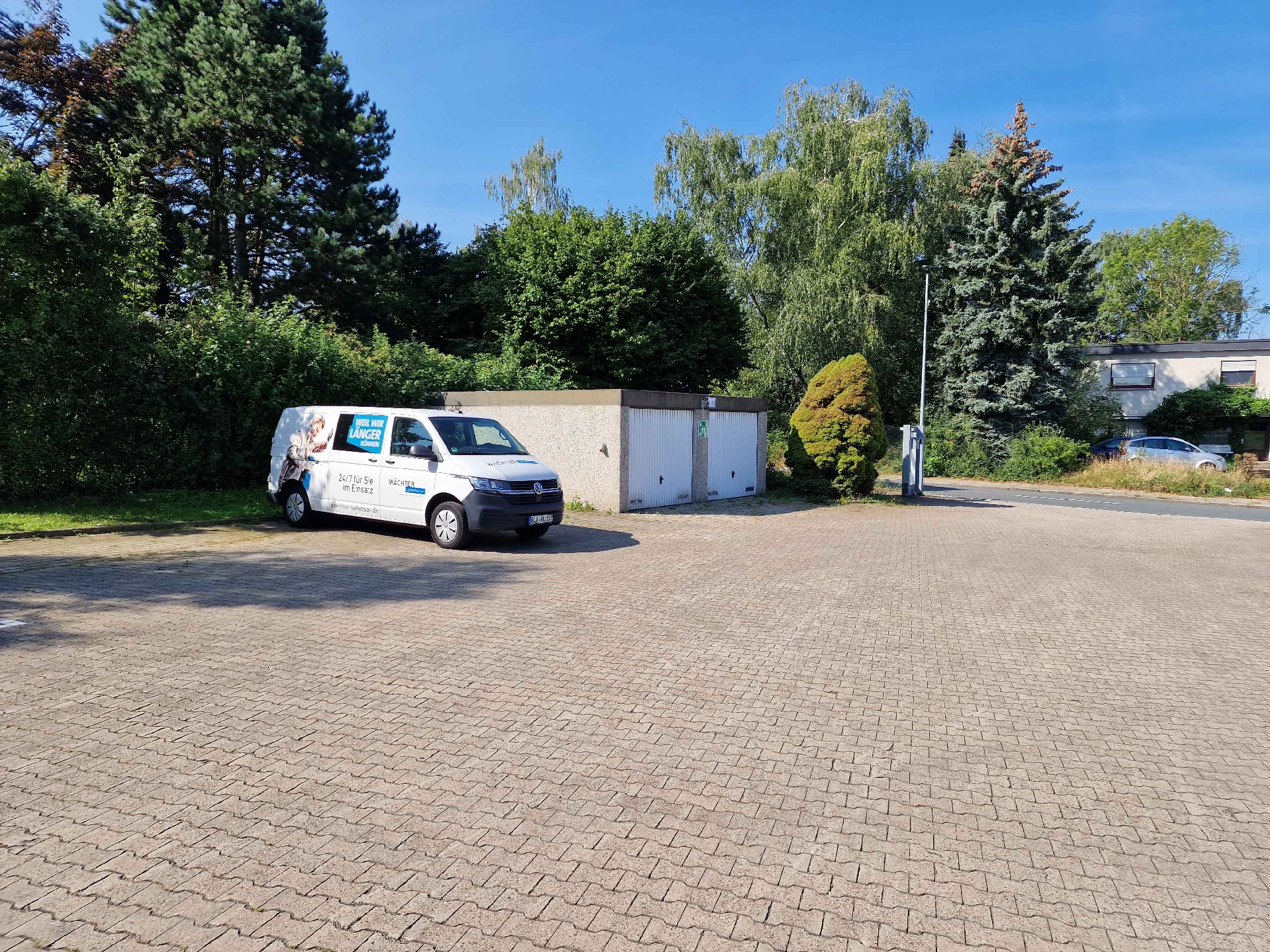 Im Außenbereich stehen Ihnen genügend Stellplätze und zwei Fertiggaragen für Mitarbeiter und Ihre Kunden zur Verfügung.