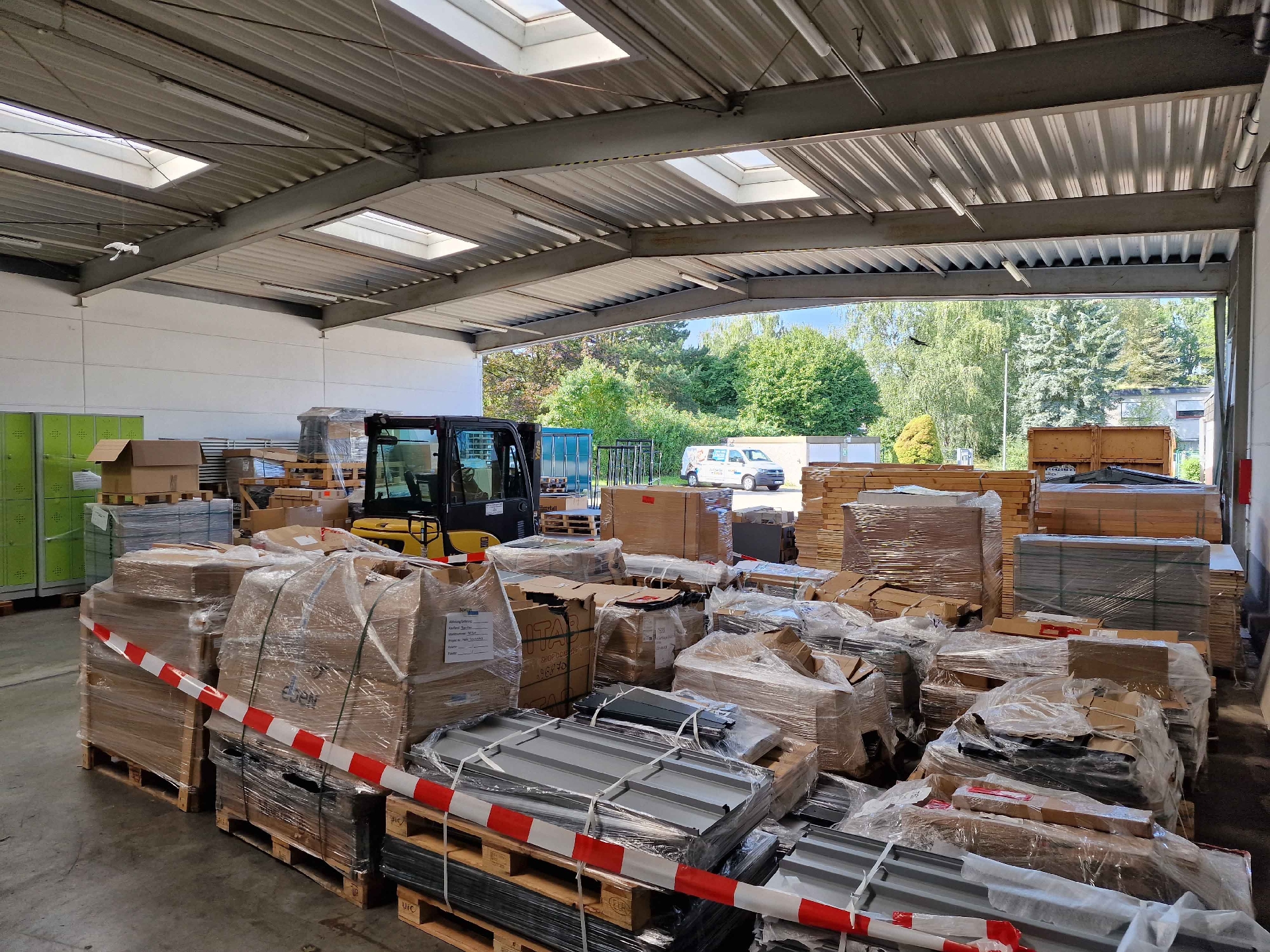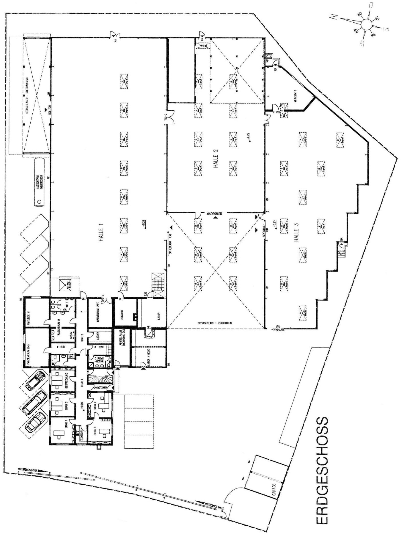 Das Objekt wurde auf einem 4.721 m² großen Erbpachtgrundstück erbaut. Große Rolltore ermöglichen das bequeme Bestücken der Lager- und Produktionsflächen, welche sich über 1.868 m² erstreckt. Die Fläche ist aufgeteilt in drei Hallenschiffe, welche miteinander verbunden sind. Wenn eine kleinteilige Nutzung der Flächen gewünscht ist, können die drei Hallen problemlos getrennt werden. Es besteht bereits jeweils eine eigene Stromverteilung für jede Halle. Diese können aufgeteilt werden in 898 m², 451 m² und 519 m². Jedes Hallenschiff verfügt natürlich über mindestens ein Rolltor. Die große Halle hat angrenzend noch ein überdachtes Außenlager von 90 m². Die drei Hallen werden über eine 336 m² große, überdachte Anlieferungsfläche bestückt. Das trockene Entladen eines Sattelschleppers ist hier unproblematisch! Tagsüber ist künstliches Licht kaum von Nöten. Die Hallenfläche verfügt über 28 Lichtkuppeln im Dach, wodurch die Fläche hell erleuchtet wird.
