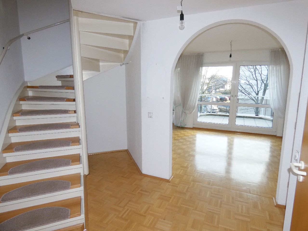 Bereits beim Betreten der Wohnung eröffnet sich ein ansprechender Blick von der Diele in den Wohnbereich, der durch einen stilvollen Rundbogen zusätzlich unterstrichen wird. Unter der Treppe befinden sich praktische Abstellmöglichkeiten, die wertvollen zusätzlichen Stauraum bieten. Ergänzt wird diese Ebene durch ein Gäste-WC.