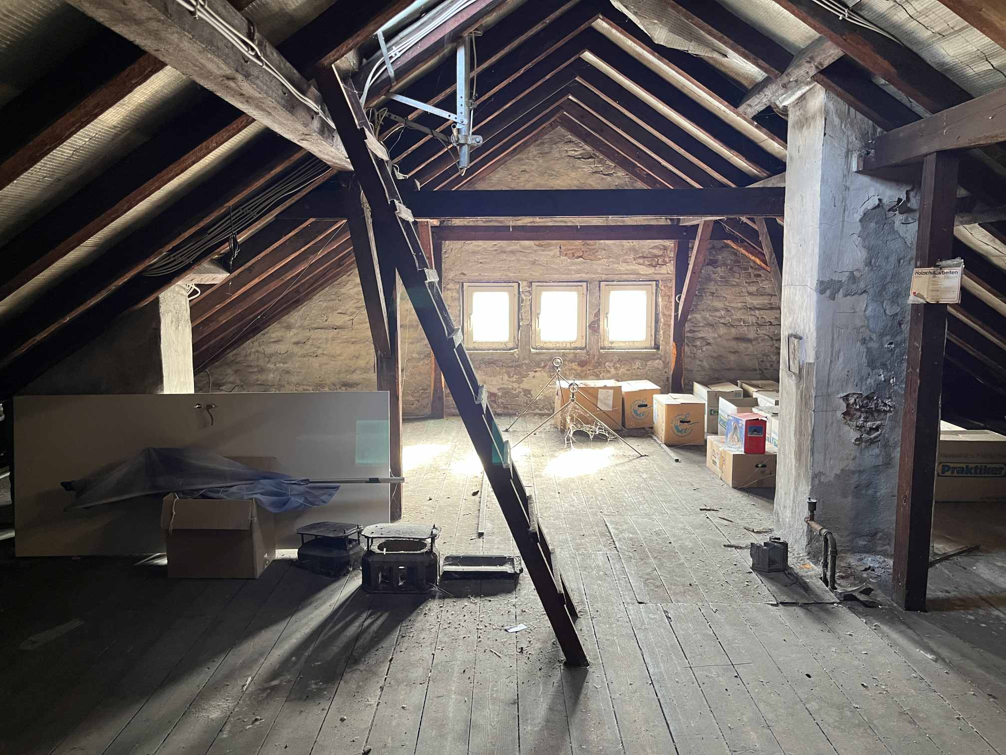 Neben zwei großen Küchen und einem überaus großzügigen Wohnbereich stehen im Haus zwei Bäder, ein Gäste-WC und insgesamt 12 Schlafräume zur Verfügung. Abstellfläche befindet sich im Keller oder in der Ausbaureserve unterm Dach.
