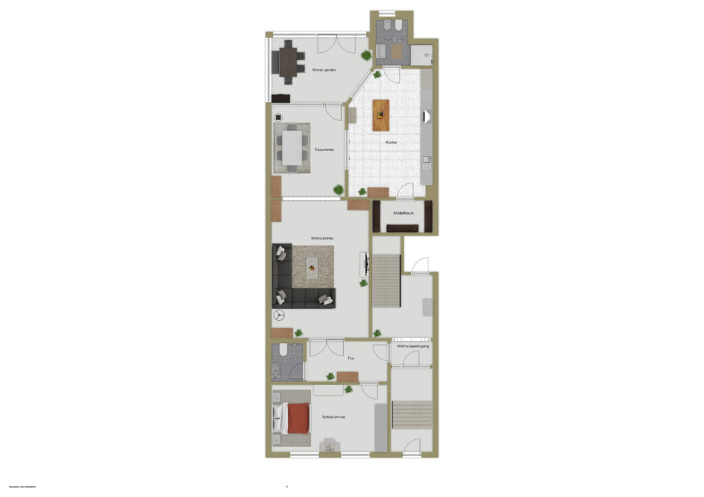 Besonders reizvoll ist der Wintergarten, der fast wie eine kleine Erweiterung des Wohnzimmers wirkt – hell, geschützt und mit direktem Zugang in den privaten Garten.