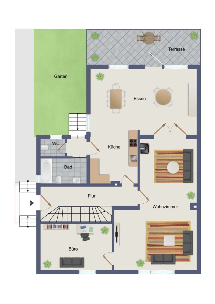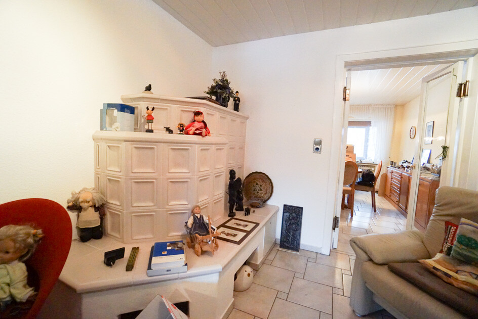Im Erdgeschoss erreichen Sie über den Flur den offen gestalteten Wohnbereich mit offener Wohn-/Essküche und Zugang zur Terrasse. Angrenzend zur Küche befinden sich ein Gäste-WC und Wannenbad. Der Kachelofen im Wohnzimmer spendet wohlige Wärme. Ein weiteres Zimmer kann als Büro dienen.