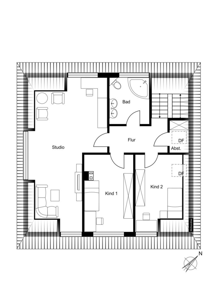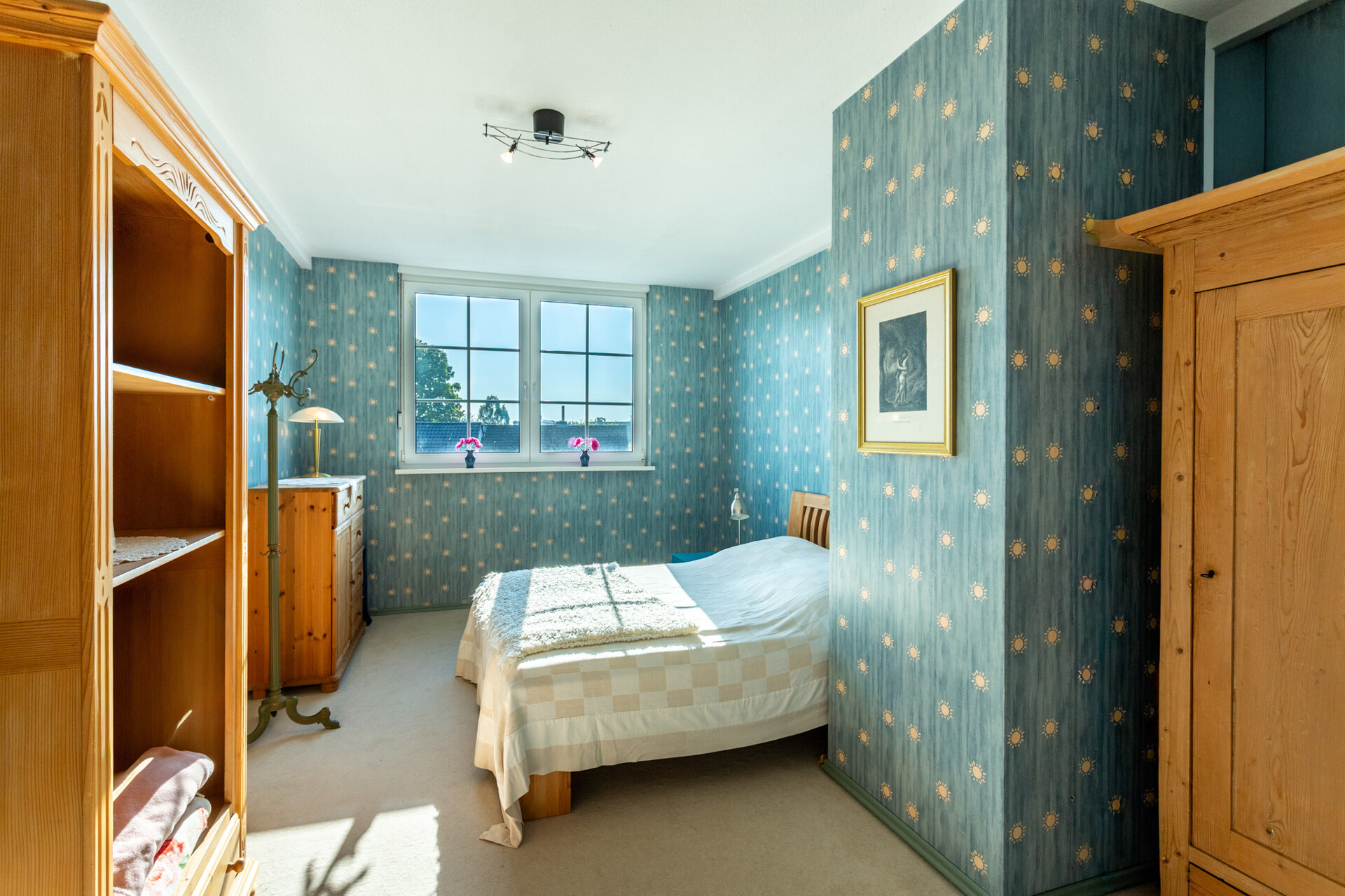 Die 2000 errichtete Aufstockung (heute Dachgeschoss) bietet drei weitere Zimmer und ein modernes Duschbad. Ideal als Kinder-, Arbeits- oder Gästezimmer – oder als eigenständige Wohneinheit, da Anschlüsse für Küche und Waschmaschine bereits vorhanden sind. Vom Dachgeschoss im Flur kann der Speicher erreicht werden. Dieser sorgt für zusätzlichen Stauraum.