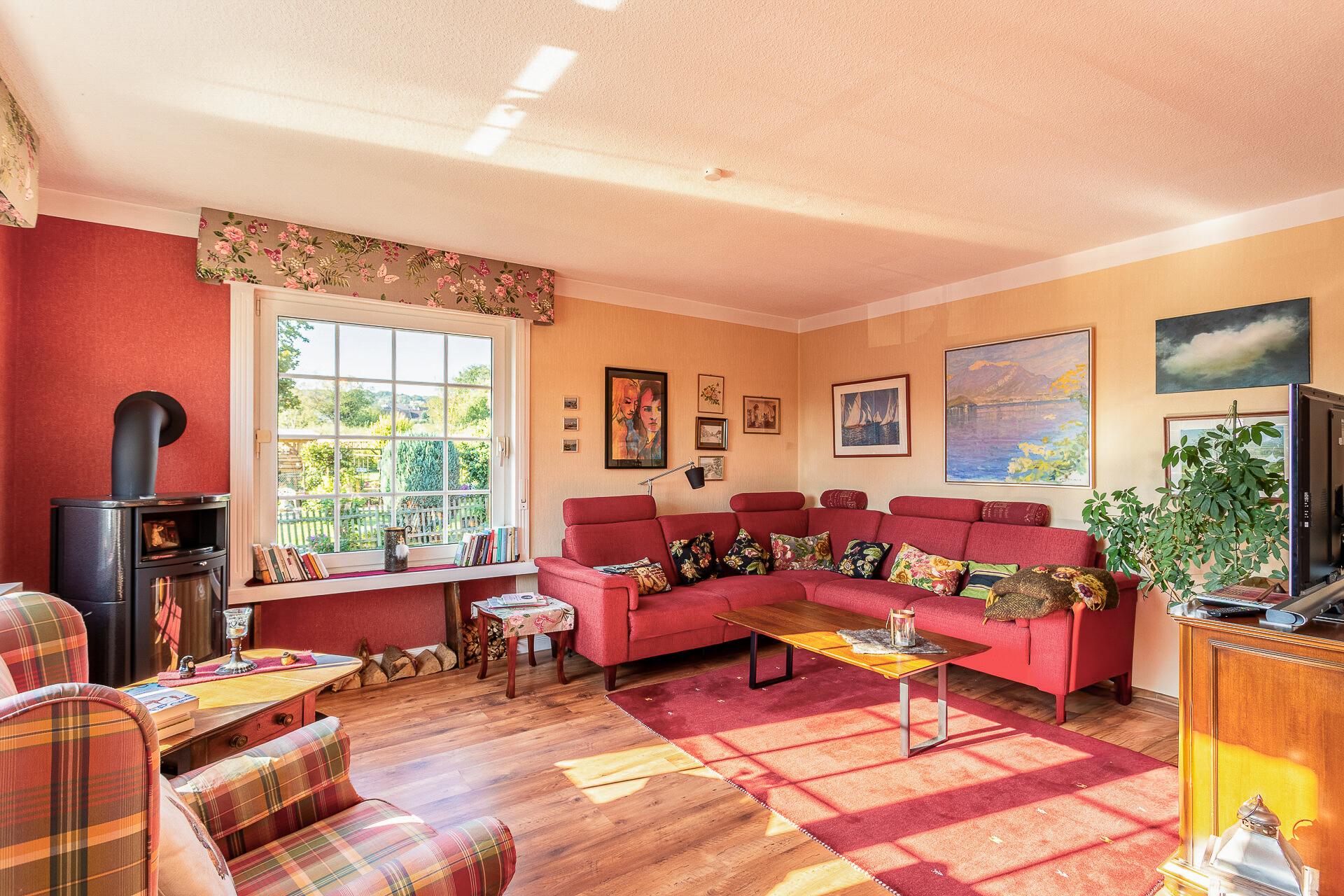 Beim Betreten des Erdgeschosses öffnet sich ein großzügig geschnittener Flur, von dem alle Räume erreichbar sind. Das Erdgeschoss umfasst ein Badezimmer mit Tageslichtfenster und Badewanne, eine traumhafte Wohnküche mit direktem Zugang zur Terrasse/Garten mit schönem Blick ins Grüne, ein gemütliches Wohnzimmer mit Kaminofen und großen Fensterfronten sowie ein Schlafzimmer. Die hochwertige Einbauküche stammt aus dem Jahr 2023. Während Flur, Küche und Badezimmer gefliest sind, verfügt das Schlafzimmer über einen Holzboden und das Wohnzimmer über hochwertigen Laminatboden.
