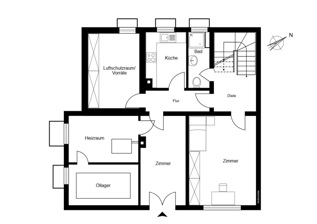 Das Untergeschoss beherbergt eine kleine Einliegerwohnung, die 2024 umfassend modernisiert bzw. renoviert wurde. Das Badezimmer mit Dusche wurde vollständig erneuert, ebenso zum größten Teil der Bodenbelag und die Wandgestaltung. Die Wohnung ist barrierefrei gestaltet und verfügt über einen ebenerdigen Zugang mit extra breiter Haustür, einen geräumigen Eingangsbereich sowie einen hellen Wohn- und Schlafbereich mit angrenzender Küche. Zusätzlich befindet sich im Untergeschoss ein weiterer großer Kellerraum, der als Staufläche genutzt werden kann und zugleich als Luftschutzraum deklariert ist.