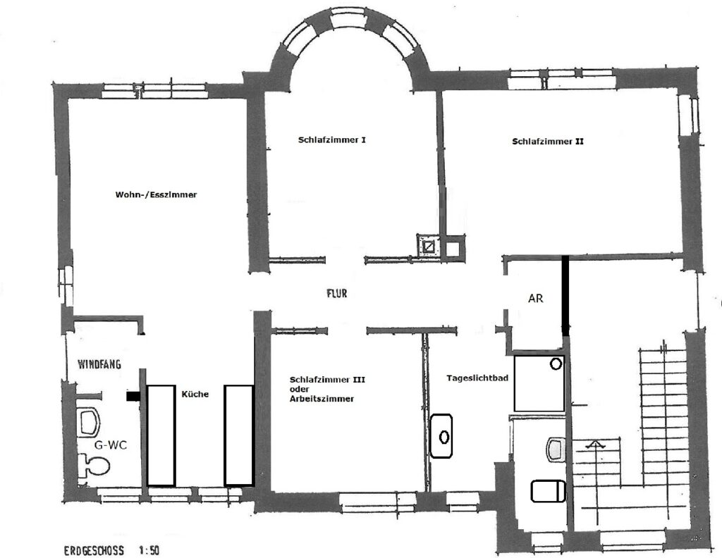 Über eine Zwischendiele ist der Schlafbereich erreichbar. Hier stehen drei Schlafzimmer (ca. 19 m²/16 m²/11 m²) zur Verfügung. Zudem wird hier ein neues Tageslichtbad mit Dusche, separatem WC sowie Anschlussmöglichkeit für Waschmaschine und Trockner entstehen. Am Ende der Diele befindet sich ein praktischer Abstellraum ideal für Vorräte, Haushaltsgeräte oder sonstige Utensilien.