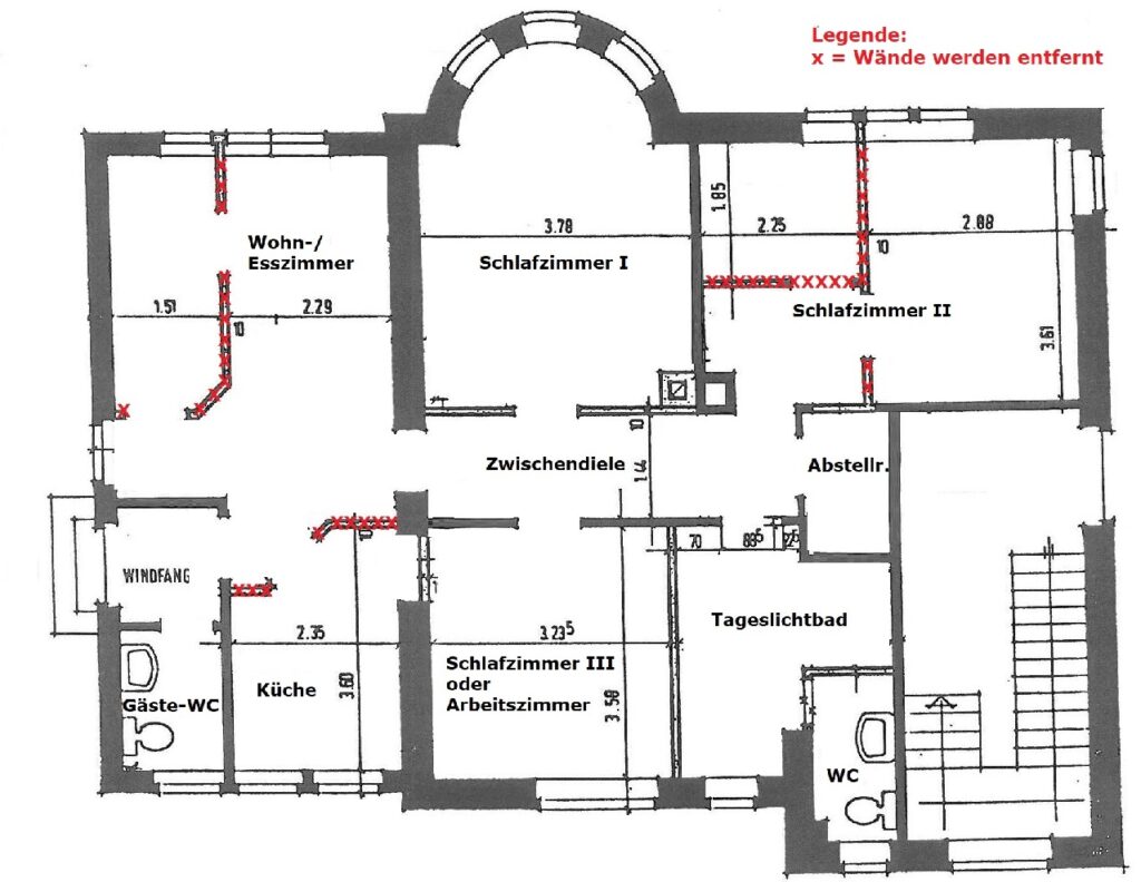 – Im Schlafzimmer II werden zwei Wände entfernt um zukünftig ein ca. 19 m² großen Raum zu schaffen.
