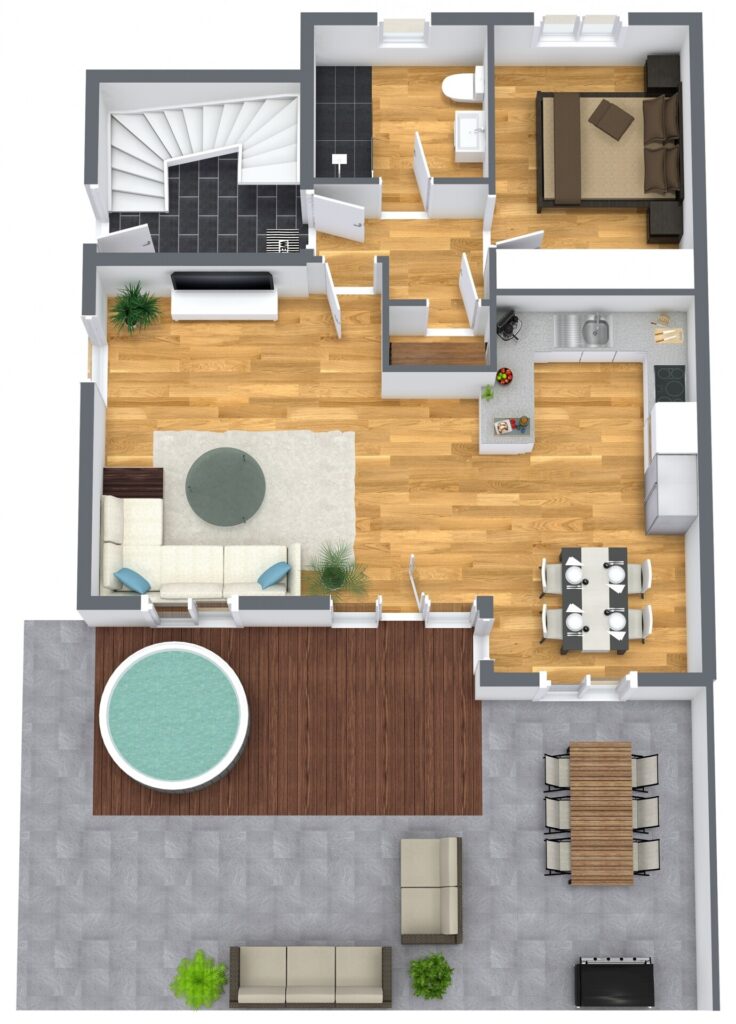 Ein weiterer Höhepunkt dieser Wohnung ist der direkte Zugang zum grünen Garten, der zur Erholung einlädt. Die großzügige, teilweise überdachte, Terrasse bietet zudem die Möglichkeit, sonnige Tage im Freien zu genießen und gesellige Stunden mit Familie und Freunden zu verbringen. Ein weiteres Highlight ist die geräumige Sauna, die sich in Ihrem neuen Garten befindet.