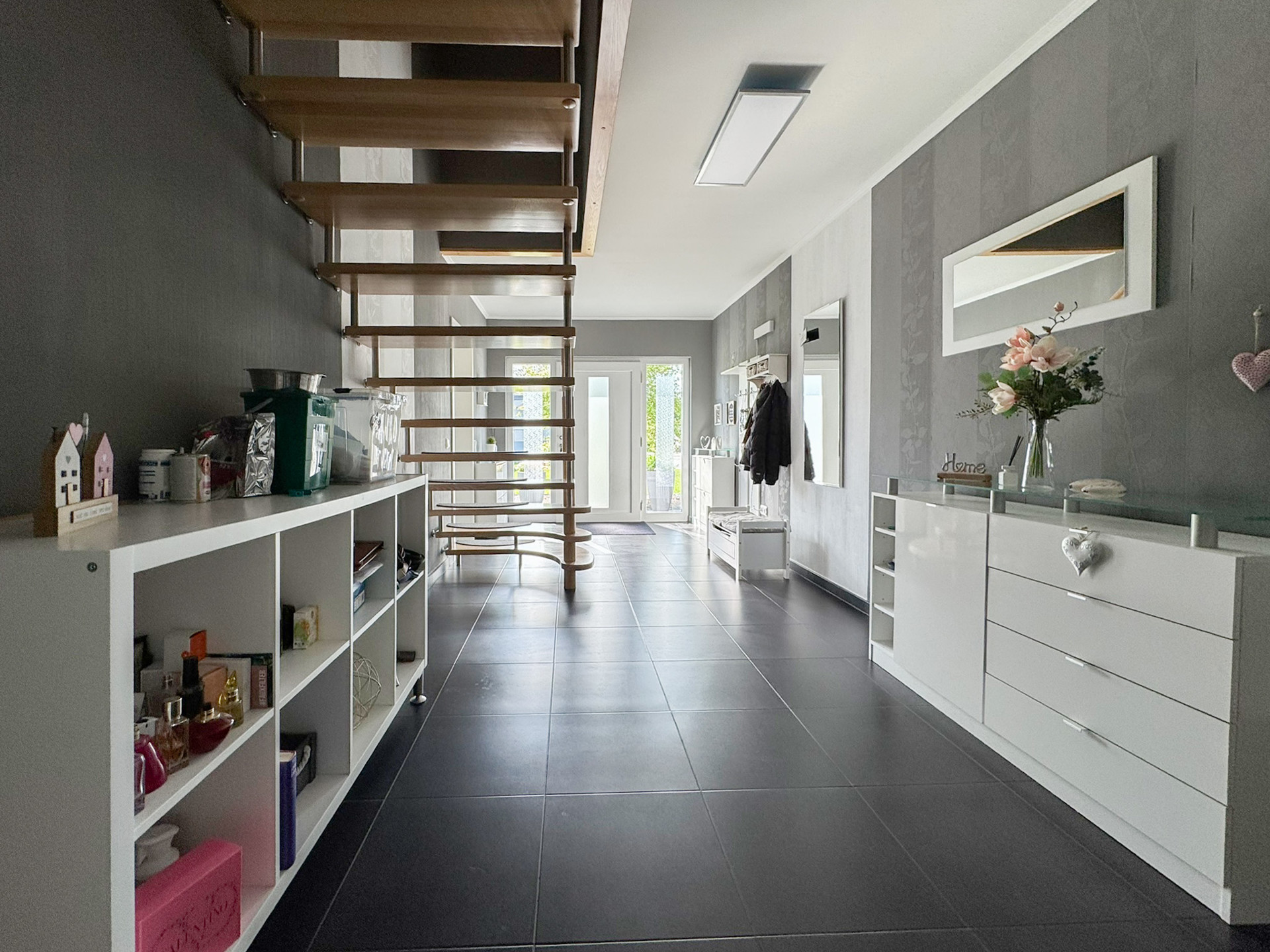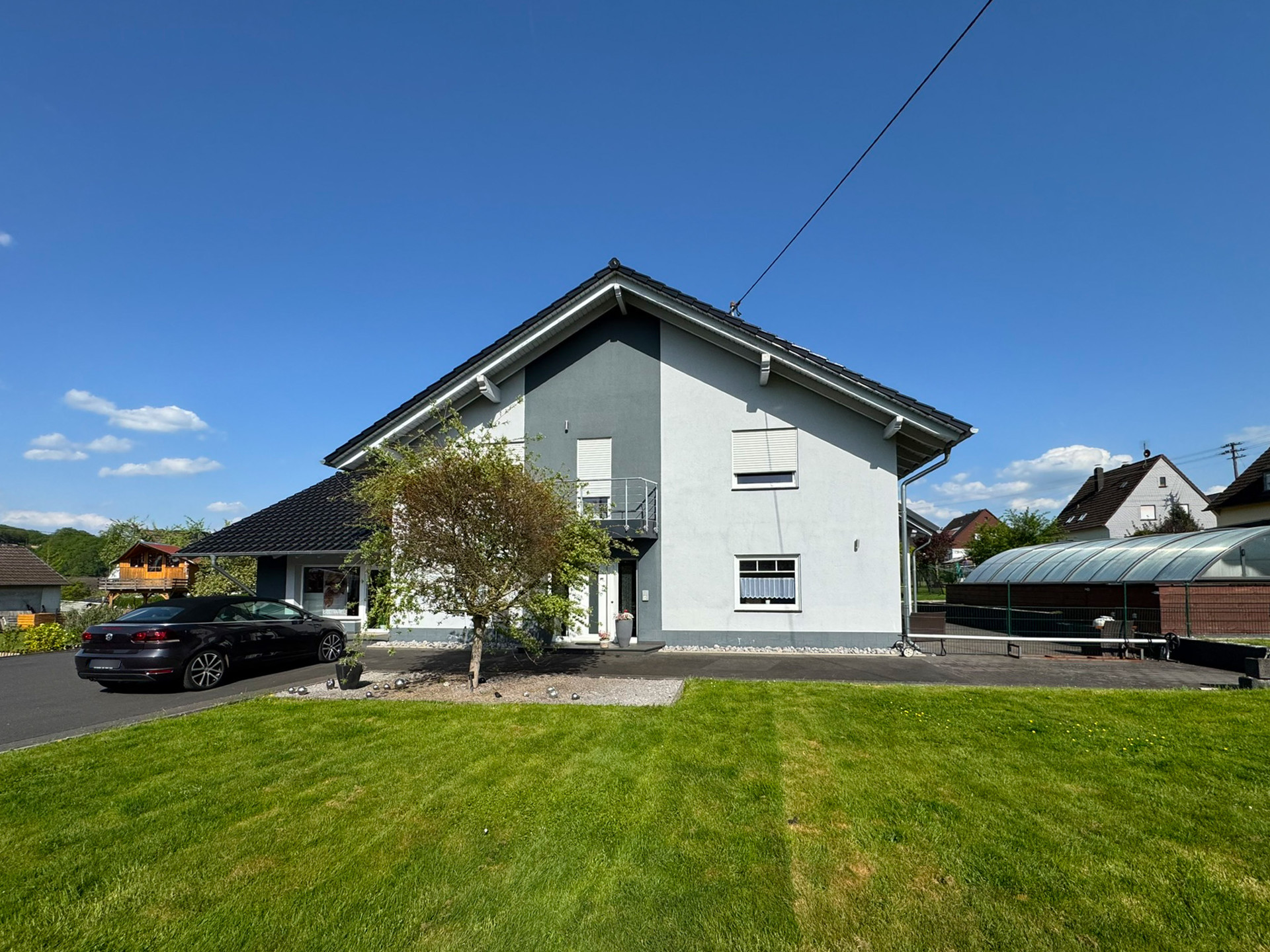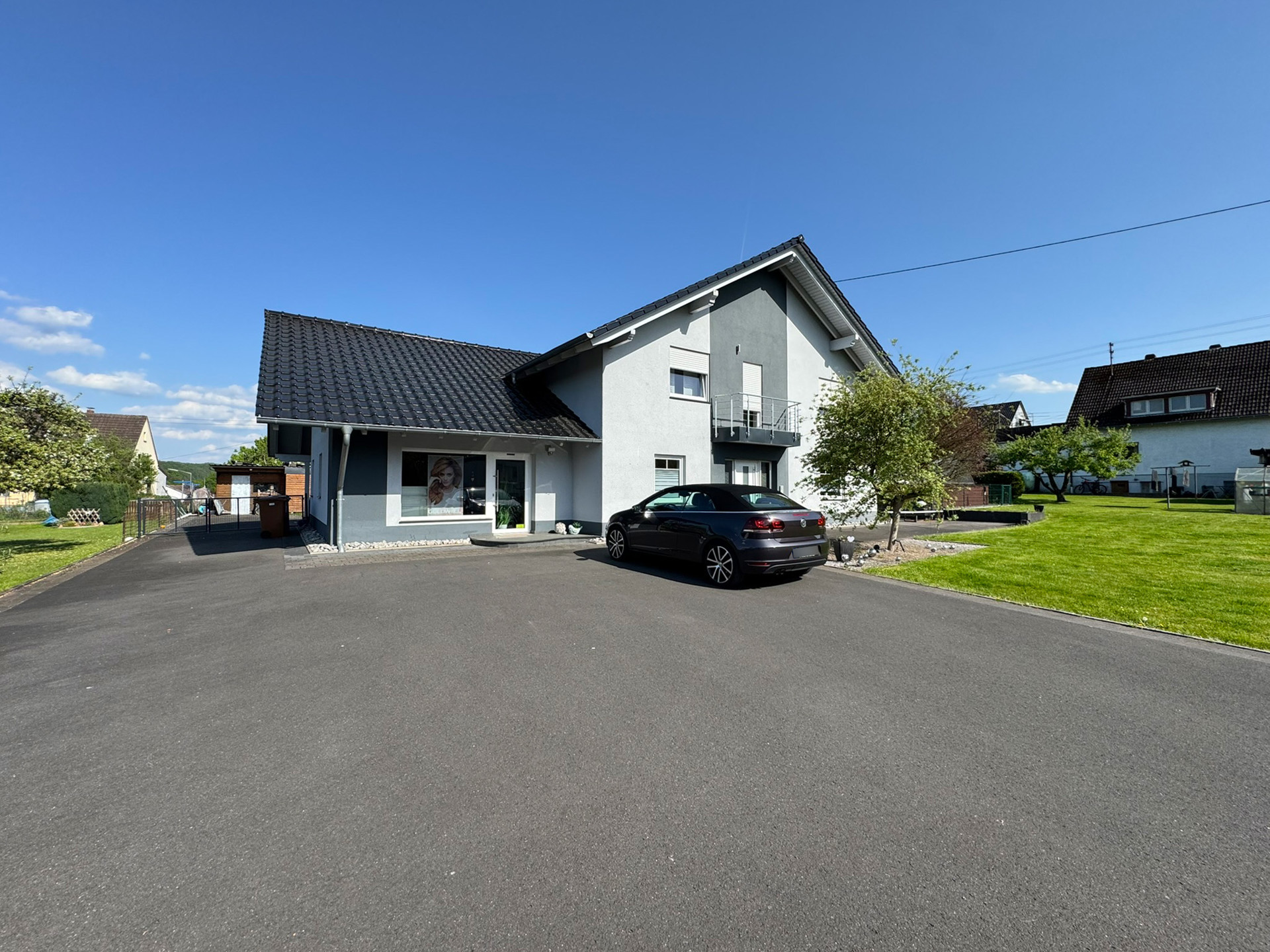 Ein besonderes Highlight ist der eigene Salon, der sich individuell nutzen lässt. Im praktischen Hauswirtschaftsraum finden Waschmaschine, Vorräte und Gefriertruhe ihren Platz. Mehrere Stellplätze auf dem Grundstück bieten ausreichend Raum für private Fahrzeuge und sind auch ideal für Kunden oder Gäste.