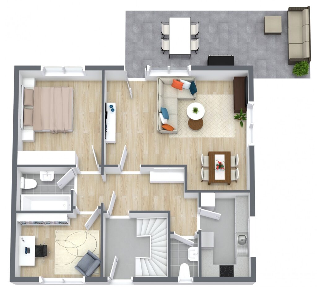 Die Grundrisse von Erd- und Obergeschoss teilen sich wie folgt auf: