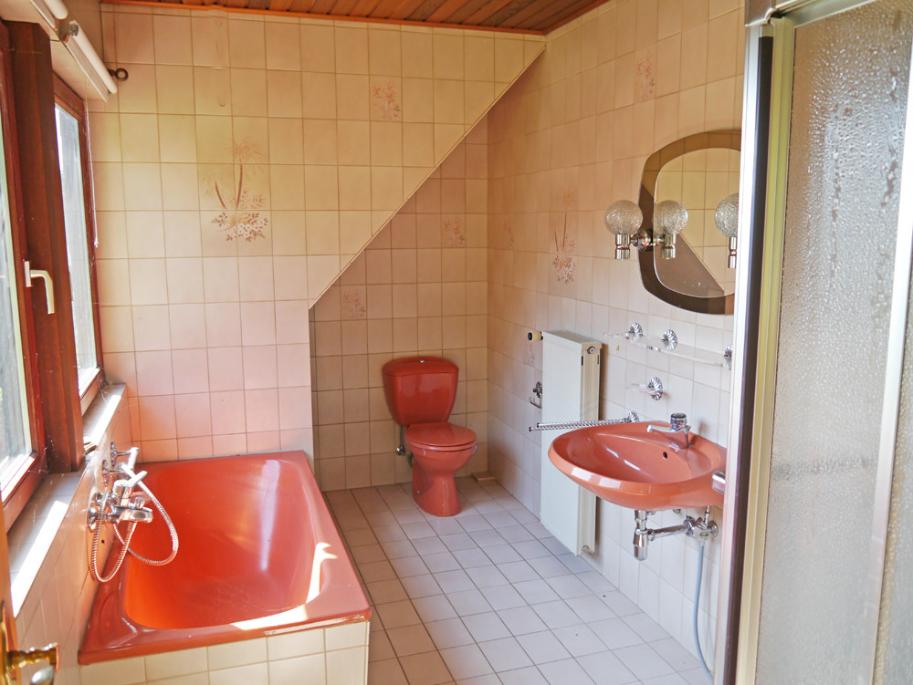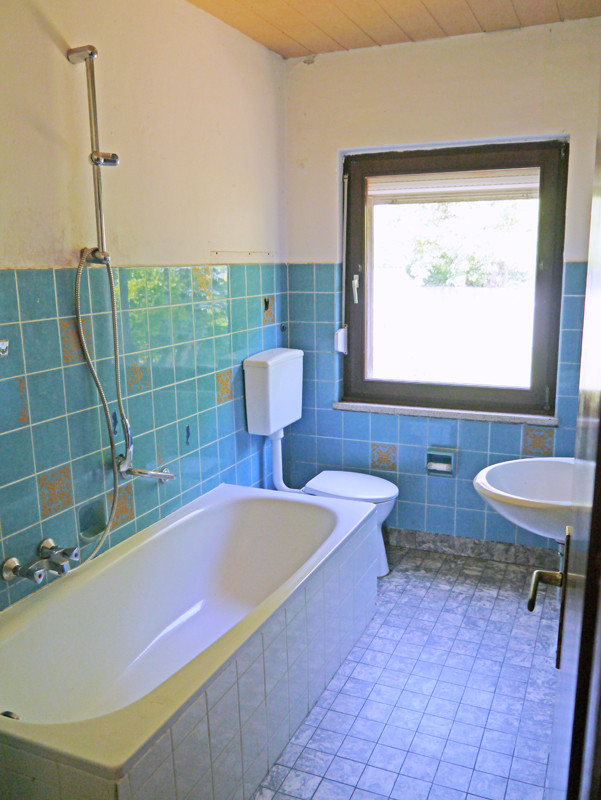 – 2 Tageslichtbäder: EG mit Wannenbad, hellblau gefliest und