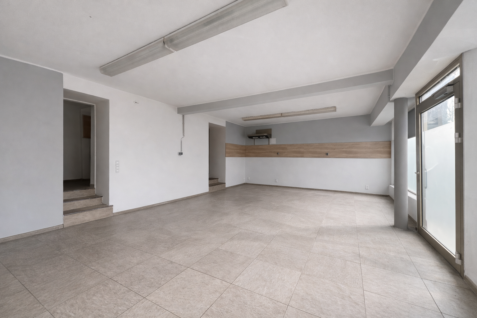 Die Nebenfläche teilt sich auf zwei, etwas höhenversetzte Räume sowie ein WC auf. Einer dieser Räume verfügt über einen Wasseranschluss und könnte somit als Küche genutzt werden, der andere als Lagerraum.
