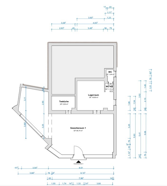 Es besteht die Möglichkeit, entweder die gesamte Fläche oder alternativ eine reduzierte Fläche von ca. 78m² ohne den seitlichen vorderen Bereich (Anbau links ca. 17m²) anzumieten.