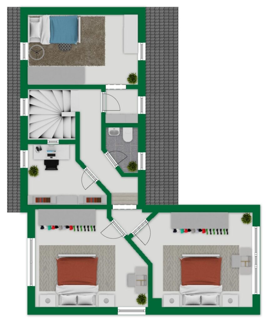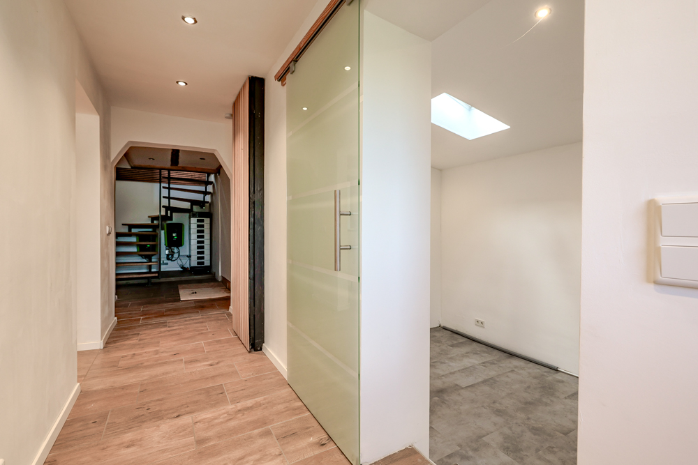 Im Obergeschoss stehen vier gut geschnittene Räume zur Verfügung, die flexibel genutzt werden können. Sichtbare Holzbalken an den Decken verleihen dieser Ebene eine angenehme Wohnatmosphäre.