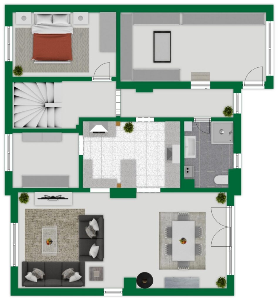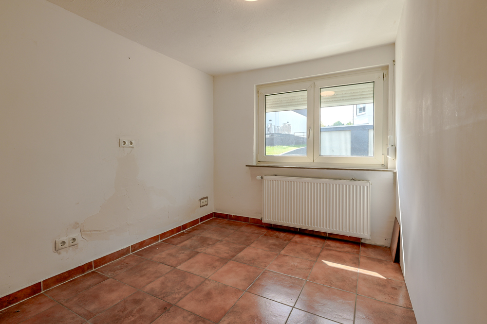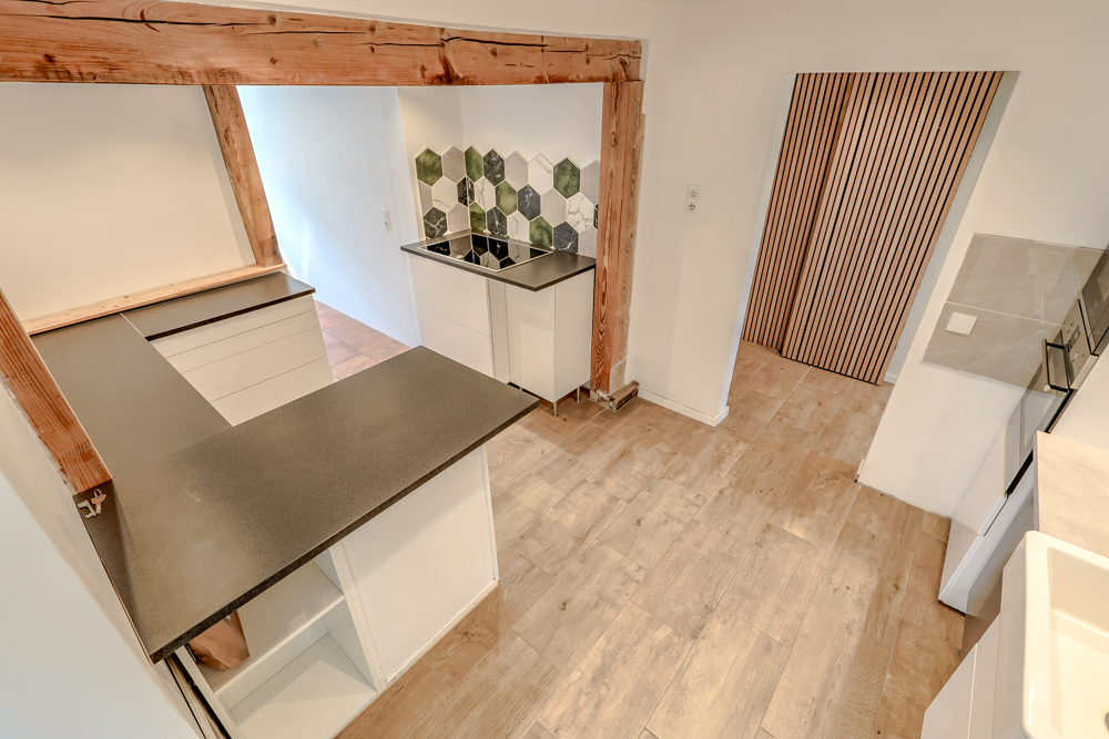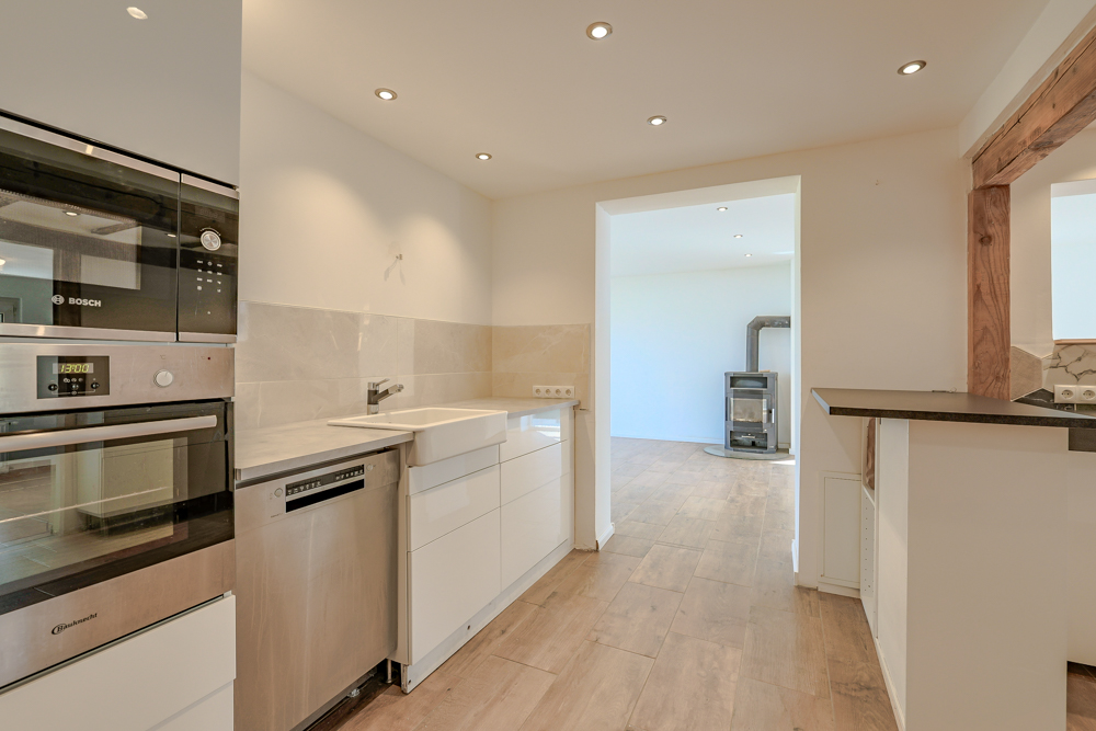 Von hier aus erschließen sich die weiteren Räume im Erdgeschoss. Dazu zählen die Küche, an die direkt ein praktischer Hauswirtschafts- bzw. Vorratsraum angrenzt, sowie der separate Wohnbereich (2021) mit Kaminofen, der eine angenehme und gemütliche Atmosphäre schafft. Zudem besteht hier die Möglichkeit, über eine kleine Treppe einen Zugang zum Garten zu schaffen, da in der Fensterfront bereits eine Tür verbaut ist. Ergänzt wird diese Ebene durch ein weiteres Zimmer sowie ein modernes Badezimmer.