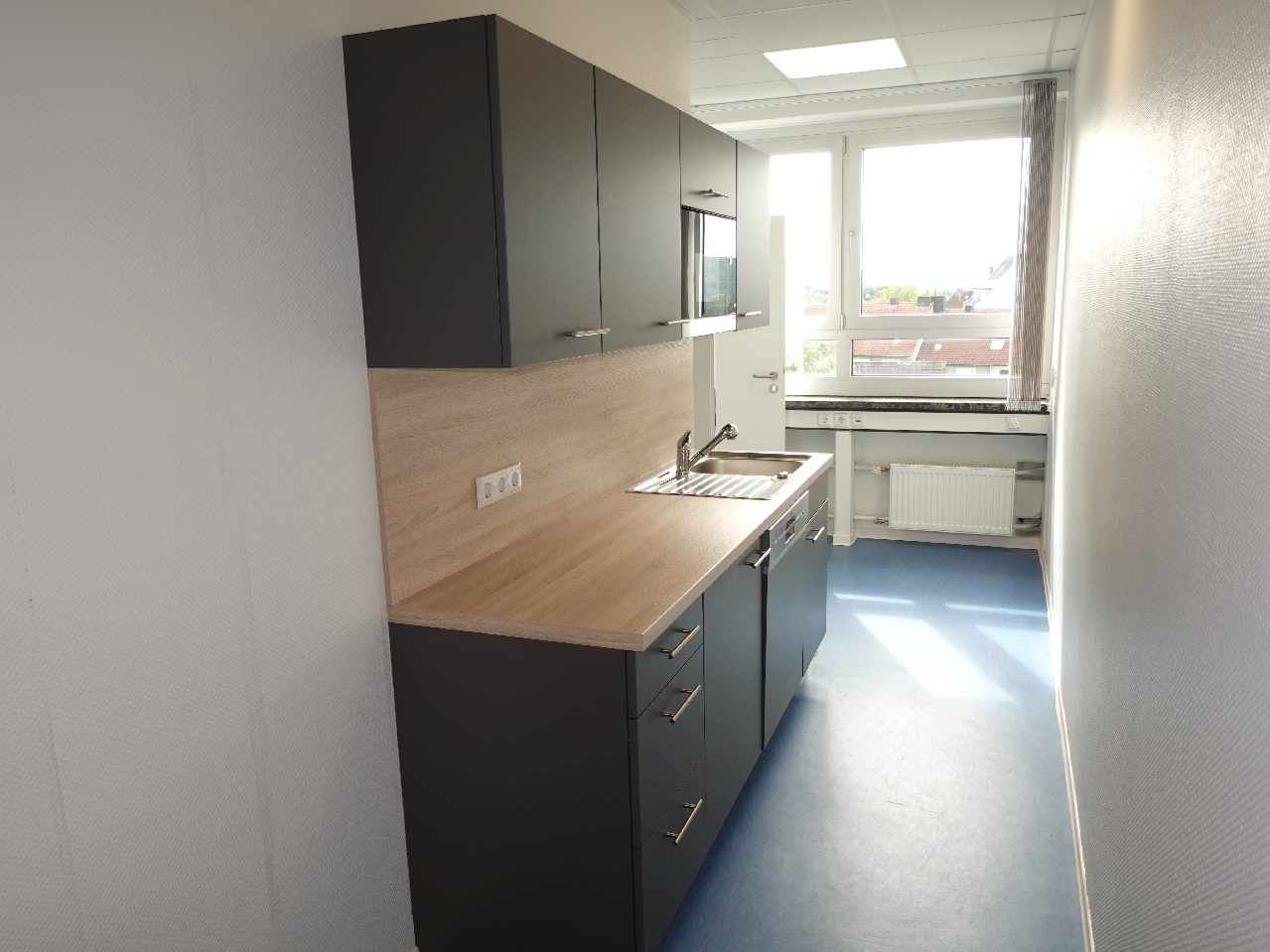 Im Erdgeschoss kann eine ca. 235 m² große Fläche angemietet werden. Diese Fläche bietet aktuell 7 Büros sowie einen Küchenbereich, der bereits mit einer Einbauküche ausgestattet ist.