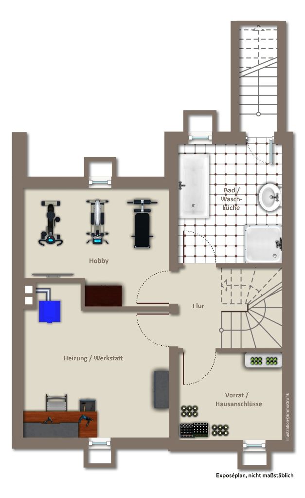 Im Kellergeschoss stehen Ihnen die üblichen Räumlichkeiten mit Hausanschlusskeller, Heizung / Werkstatt, Hobbyraum und Waschküche zur Verfügung. Im Hobbyraum befindet sich eine eingebaute Sauna und die Waschküche wurde mit Badewanne, Dusche und Waschbecken zu einem weiteren Badezimmer erweitert. Die Kellerausgangstreppe führt in den Wintergarten und ist über eine Türe weiterhin direkt mit dem Garten verbunden.