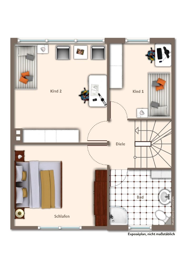 Im Obergeschoss stehen 3 Schlafräume sowie das Tageslichtbad mit Dusche zur Verfügung. Die Innentreppe führt in das wohnlich bereits ausgebaute Dachgeschoss (ca. 32 m² sind in der Wohnfläche nicht enthalten!).