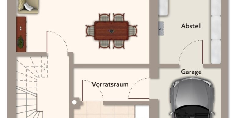 Im Erdgeschoss befinden sich ein einladender Eingangsbereich mit Gäste-WC, eine Küche mit angrenzendem Vorratsraum sowie ein großzügiges Wohnzimmer mit breiter Fensterfront und direktem Zugang zur Terrasse und in den Garten.