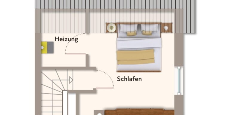Der ausgebaute Spitzboden bietet weiteren Raum und überzeugt durch eine Deckenhöhe von bis zu ca. vier Metern – ideal als Arbeits-, Gäste- oder Hobbybereich. Hier ist auch die Gas-Zentralheizung in einem kleinen Abstellraum untergebracht.