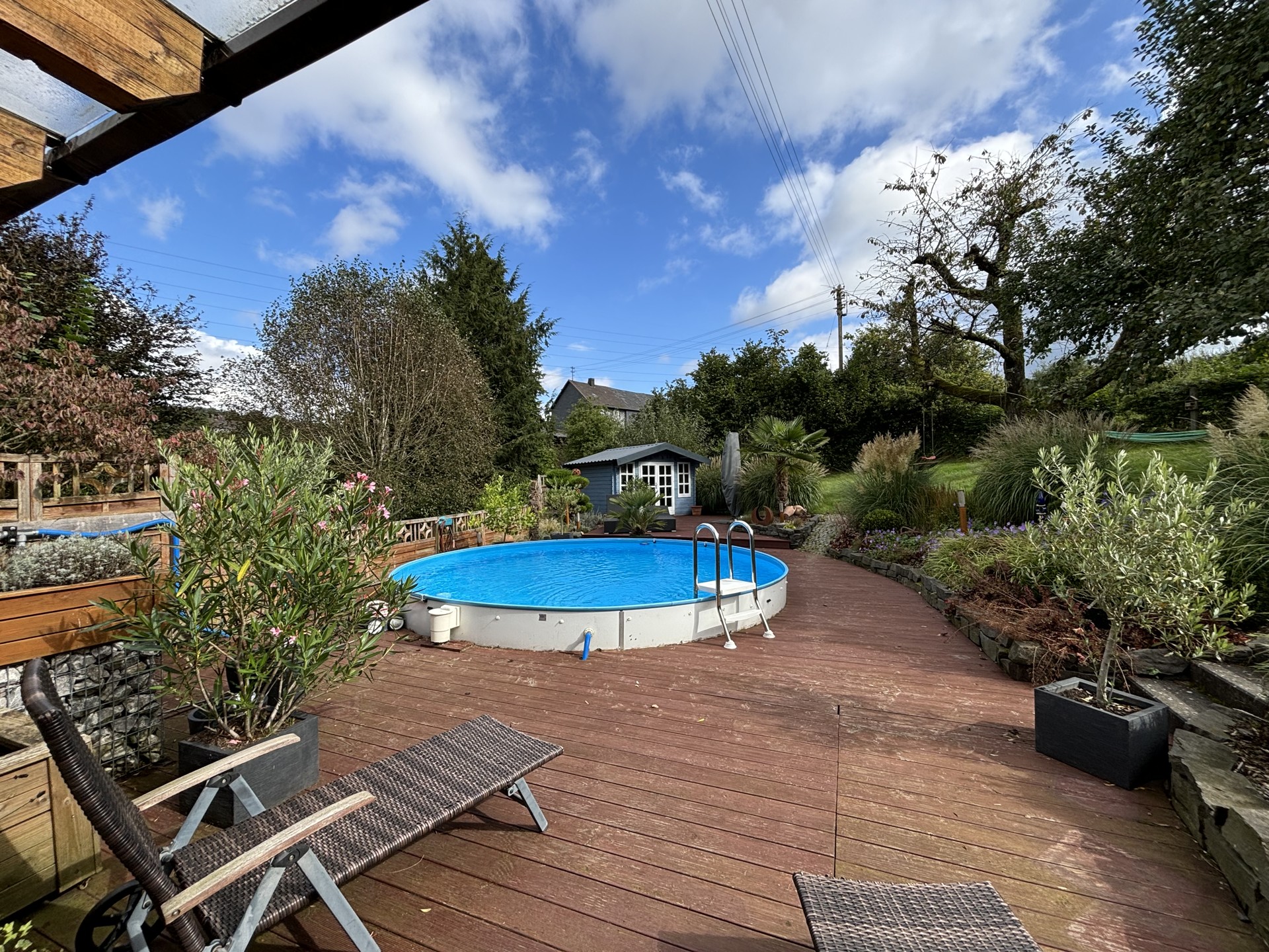 Der großzügig angelegte, uneinsehbare Garten ist eine wahre Oase der Ruhe. Hier trifft stilvolle Gestaltung auf Funktionalität: Ein gepflegter Pool lädt an warmen Sommertagen zum Schwimmen ein, während das charmante Gartenhaus zusätzlichen Stauraum oder einen gemütlichen Rückzugsort bietet. Weite Rasenflächen, gesäumt von üppigen Blumenbeeten und schattenspendenden Bäumen, schaffen ein Ambiente, das zum Verweilen und Entspannen einlädt. Das gegenüberliegende Grundstück mit einer Größe von ca. 283 m² gehört ebenfalls zum Objekt und kann individuell genutzt werden.