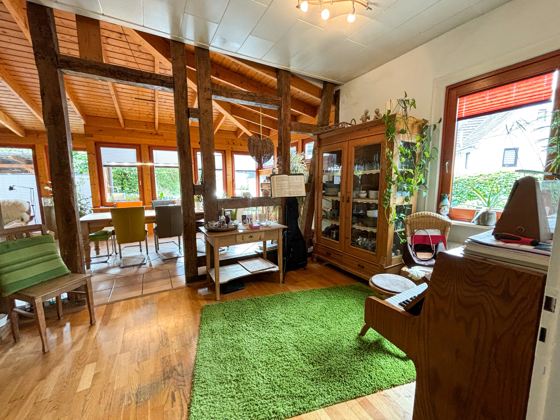 Dieses zauberhafte Fachwerkhaus bietet den perfekten Rückzugsort für alle, die eine Immobilie in einem überwiegend exzellenten Zustand und mit viel Liebe zum Detail suchen. Das Erdgeschoss des Hauses besticht durch seine großzügigen und lichtdurchfluteten Räume. Im Anbau befindet sich ein gemütlicher Wintergarten, der dank der bodentiefen Fenster den Blick in den traumhaften Garten freigibt. Hier sorgt eine Fußbodenheizung auch an kalten Tagen für wohlige Wärme. Das luxuriöse Badezimmer im Erdgeschoss lässt keine Wünsche offen: Eine bodentiefe Regendusche, eine Badewanne und hochwertige Materialien bieten Wellness-Feeling pur. Der offene Wohnbereich wird durch einen stilvollen Kamin komplettiert, der in den Wintermonaten für behagliche Stunden sorgt. Die moderne Küche ist das Herzstück des Hauses. Ausgestattet mit einer großzügigen Kochinsel und einer Theke, lädt sie zu geselligen Kochabenden und kulinarischen Highlights ein. Das Obergeschoss befindet sich in einem gepflegten Zustand, bedarf jedoch einer Renovierung, um das Potenzial des Hauses voll auszuschöpfen. Der geräumige Dachboden bietet weiteres Ausbaupotenzial, um zusätzlichen Wohnraum zu schaffen – ideal für ein weiteres Schlafzimmer, ein Arbeitszimmer oder einen Hobbyraum.