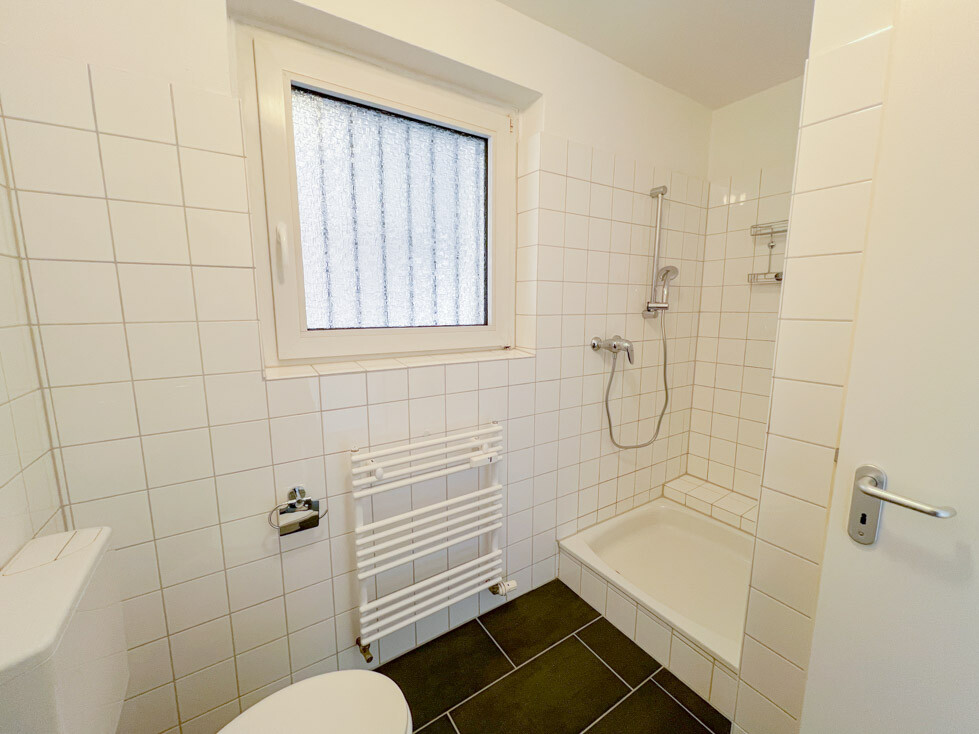 Direkt gegenüber vom Wohnungseingang liegt das Tageslichtbad. Es ist mit hellen Fliesen, einer Dusche, einem beleuchteten Spiegelschrank und einem Handtuchheizkörper ausgestattet.