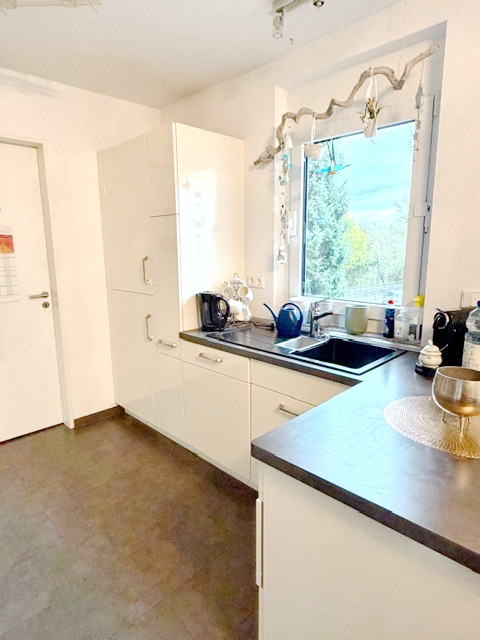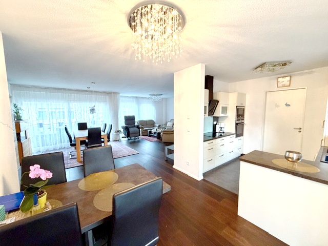 Der lichtdurchflutete Wohn- und Essbereich mit integrierter Einbauküche bildet das Herzstück der Wohnung perfekt für gesellige Abende oder entspannte Stunden im Familienkreis.