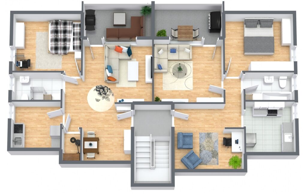 Die Gesamtwohnfläche beträgt ca. 435,33 m² und verteilt sich auf vier 3-Zimmer-Wohnungen sowie zwei 2-Zimmer-Wohnungen. Sämtliche Einheiten verfügen über funktionale Grundrisse mit gut nutzbaren Raumgrößen und sind jeweils mit Terrasse, Balkon oder Loggia ausgestattet. Die beiden Erdgeschosswohnungen bieten zudem einen direkten Zugang zum Garten. Die Wohnungen im Dachgeschoss profitieren von einer angenehmen Raumhöhe und einer guten Belichtung.
