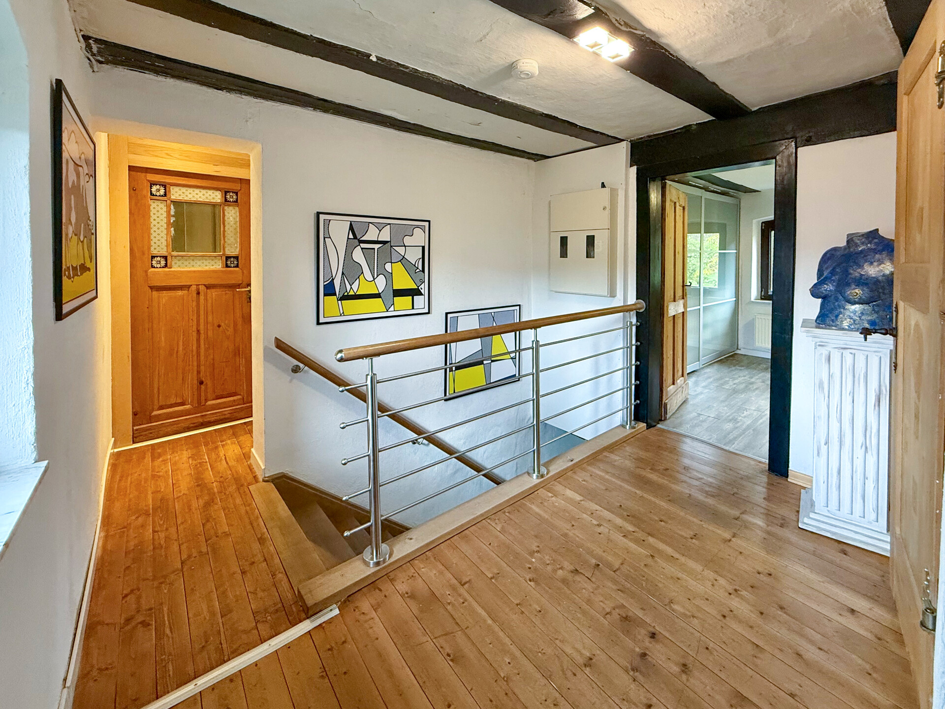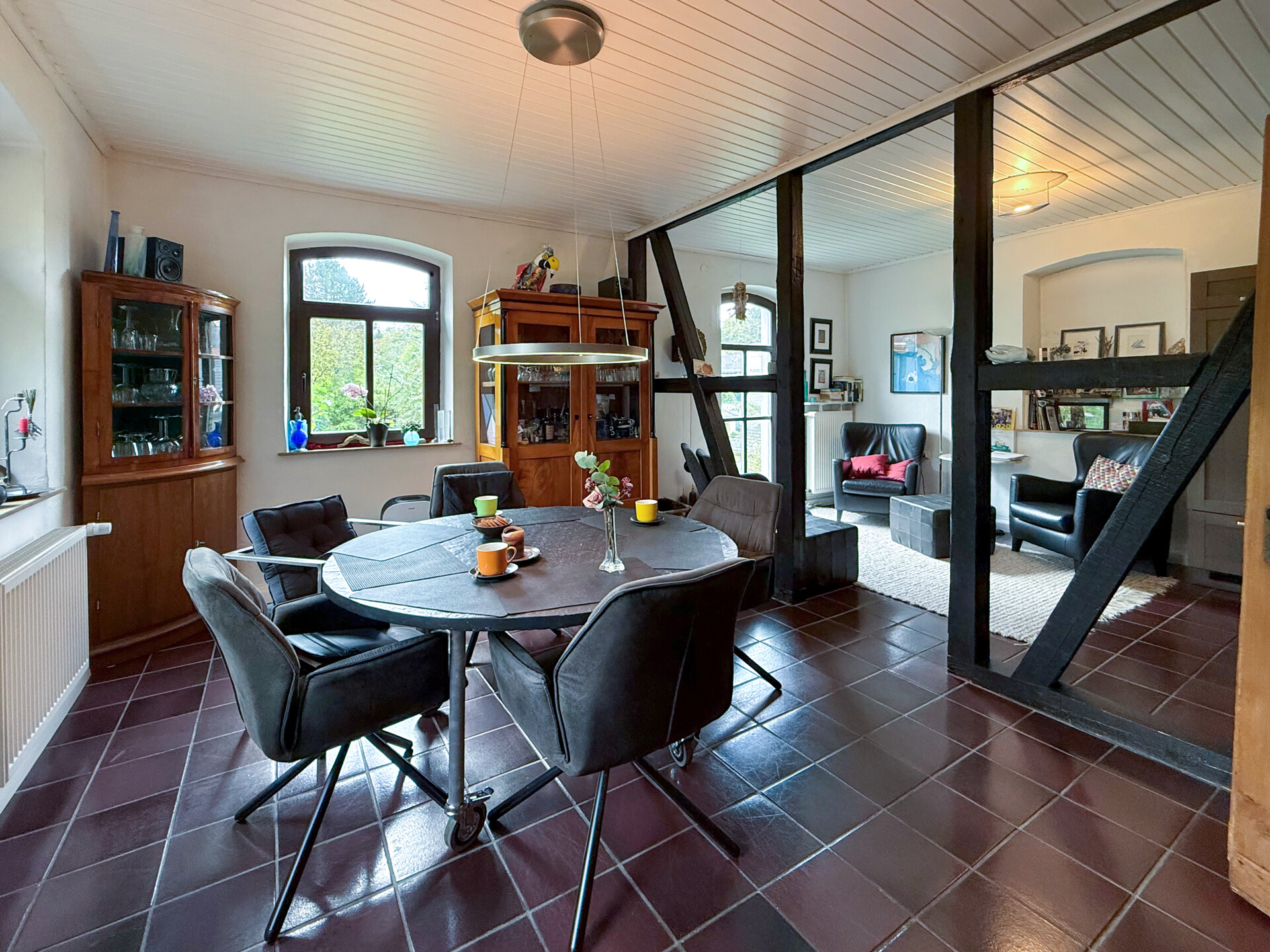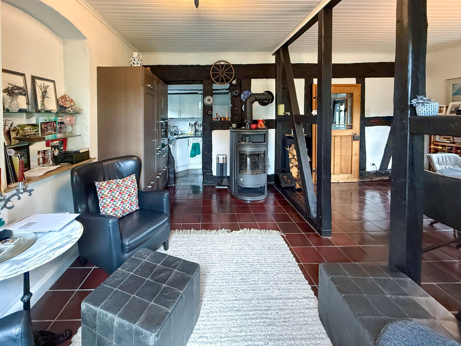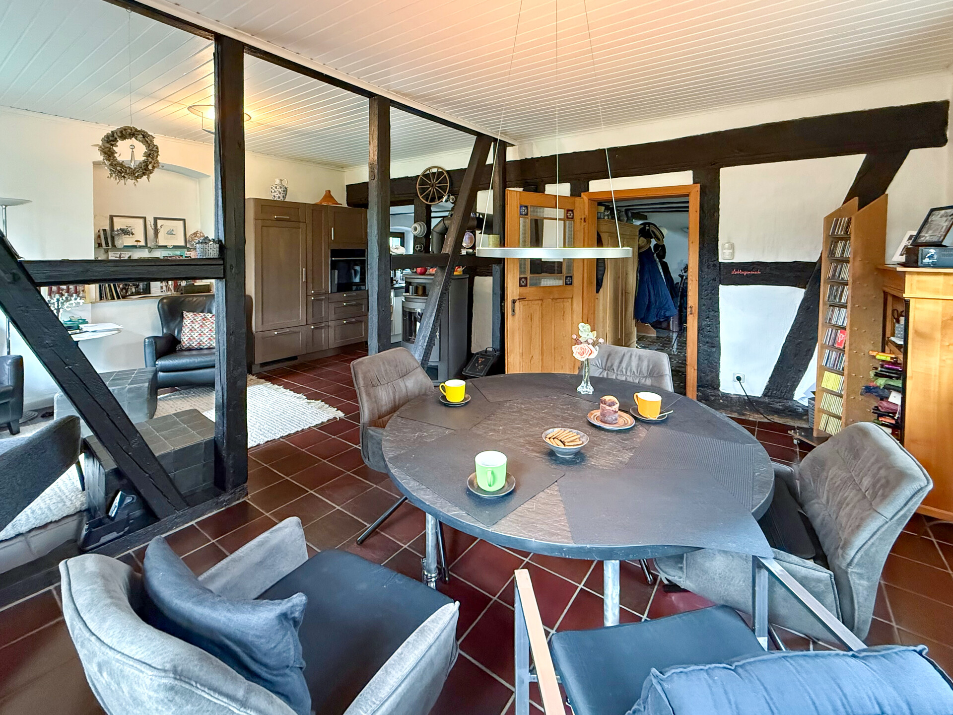 Dieses liebevoll modernisierte, ehemalige Fachwerkhaus mit Ursprung um 1800 vereint historischen Charme mit modernstem Wohnkomfort. Auf einem Grundstück von rd. 1.403 m² präsentiert sich das Anwesen – nach stetigen Sanierungen und Renovierungen von 1981 bis heute – in einem sehr guten Zustand! Im Erdgeschoss ist das Wohnen nahezu altersgerecht möglich: Neben dem gemütlichen Wohn-/Essbereich stehen eine hochwertig ausgestattete Küche, ein Wannenbad sowie ein Schlafzimmer oder Büro zur Verfügung. Im ersten Obergeschoss erwarten Sie ein eindrucksvolles Schlafzimmer mit Galerie, ein Kinderzimmer oder eine Ankleide, ein sep. WC sowie ein Wellness-/Saunaraum – perfekt für entspannte Stunden. Ein weiteres Zimmer befindet sich im Dachgeschoss. Insgesamt verfügt das Haupthaus über rd. 174 m² Wohnfläche. Ergänzt wird das Angebot durch vielfältige Nebennutzungen: Im Erdgeschoss der Scheune befinden sich Werkstatt, Heizung/Waschküche und ein Nebenraum, im Obergeschoss ein großzügiger Hobbyraum. Drei Kellerräume bieten zusätzlichen Stauraum. Zum Anwesen gehören außerdem ein Doppelcarport mit Wallbox und Abstellraum, ein Pavillon sowie das wunderschön angelegte Gartengrundstück – ein echtes Refugium, für alle, die Qualität und Gemütlichkeit schätzen!