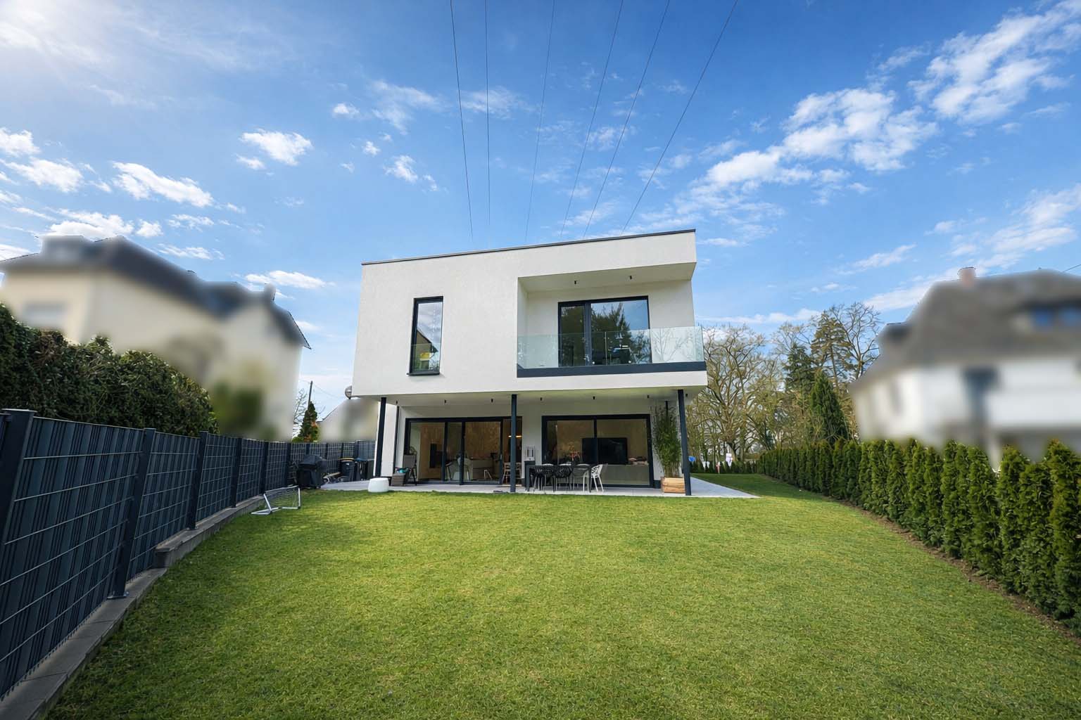 Auch technisch überzeugt die Immobilie: Photovoltaikanlage mit ca. 15 kWp und Huawei-Speicher, Buderus-Wärmepumpe, KNX-Smart-Home-System, Alarmanlage, dreifach verglaste Sondermaß-Fenster, Velux-Dachfenster mit Regensensor sowie Klimatisierung von Wohnbereich, Studio und Schlafzimmern. Hochsicherheits-Hauseingangstüren, Fertigbetondecken, zwei Satellitenanlagen und ein elektrisches Hörmann-Garagentor runden die hochwertige Ausstattung ab.
