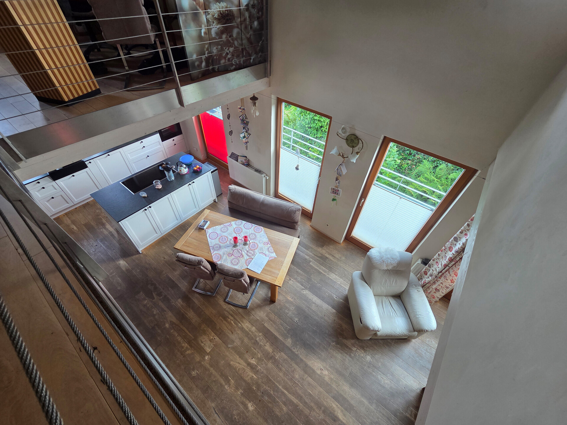 Das Haus wurde 2000 in ökologischer Holzständerbauweise errichtet, mit Holzfaserdämmplatten gedämmt und bietet ca. 177 m² Wohnfläche mit offen gestalteten Räumen, freiliegenden Balken, einer offenen Galerie und viel natürlichem Licht. Für ein gesundes Wohnklima sorgen 3 cm starker Lehm- und Marmormehlputz. Ein Kaminofen im Wohnzimmer sowie hochwertige Echtholzböden aus Buche schaffen eine warme, einladende Atmosphäre.