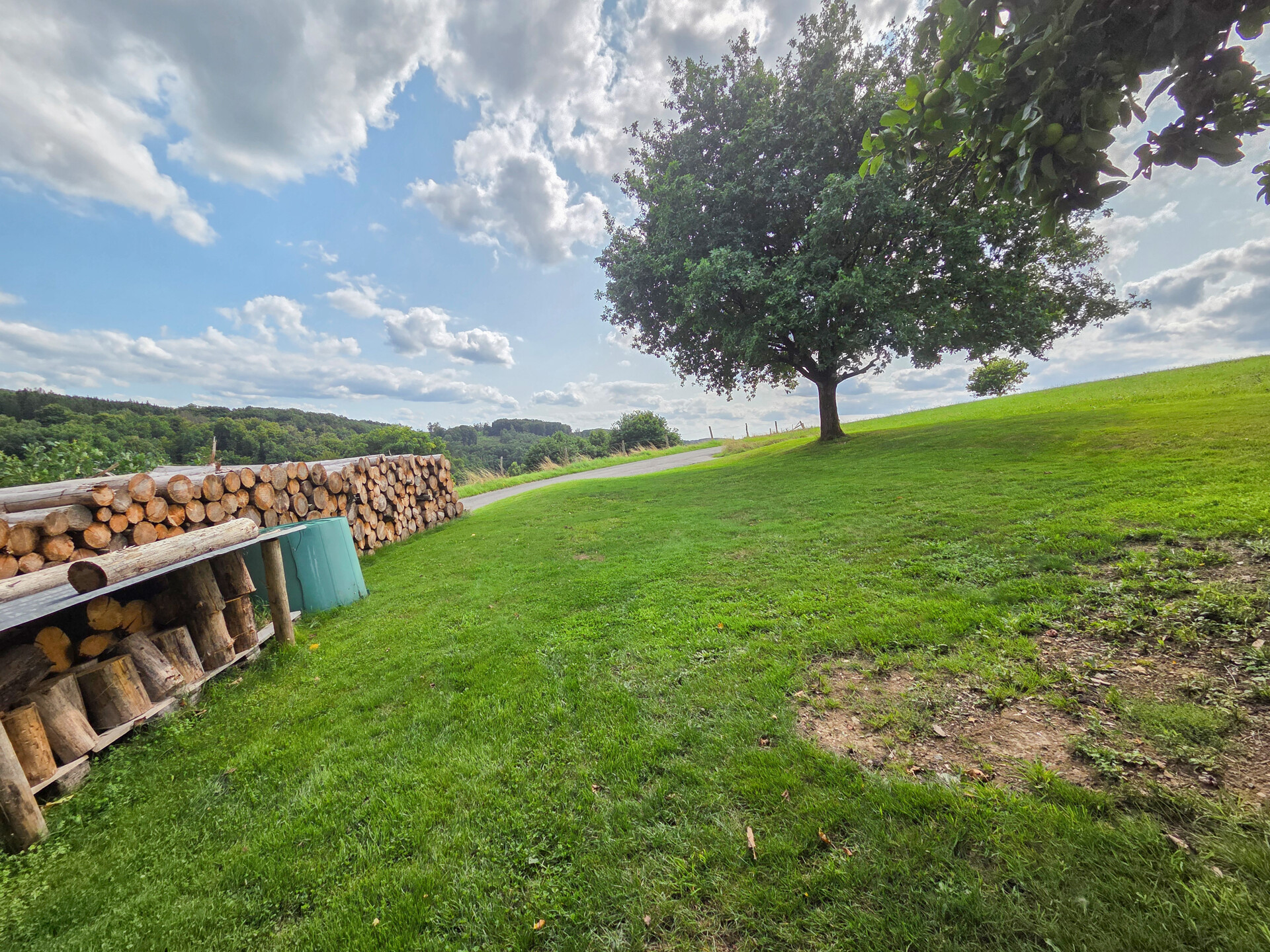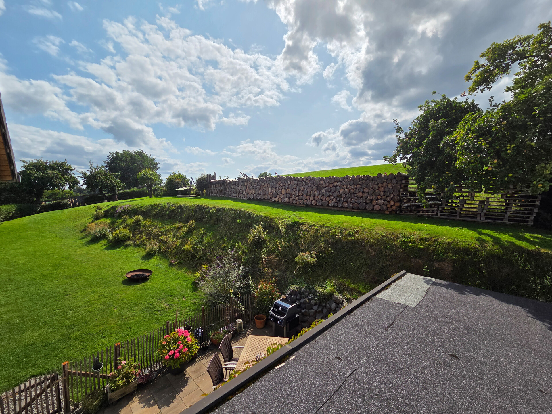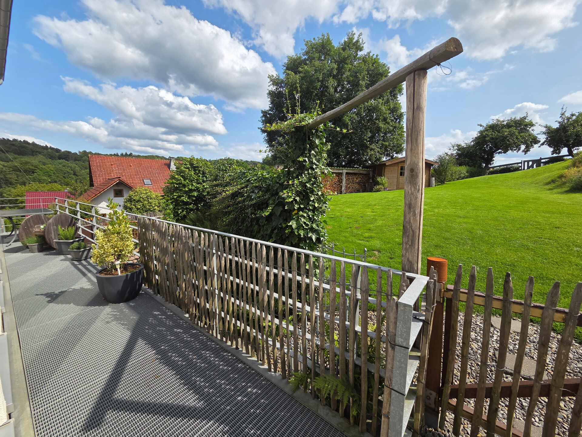 Die Highlights im Außenbereich: das weitläufige Grundstück, eine große, teils überdachte Terrasse mit herrlichem Blick ins Grüne, zwei Balkone, eine Hollywoodschaukel mit Ausblick, zwei Schuppen, ein Holzlager sowie eine 6.000 l Regenwasserzisterne. Ein Doppelcarport steht ebenfalls zur Verfügung.
