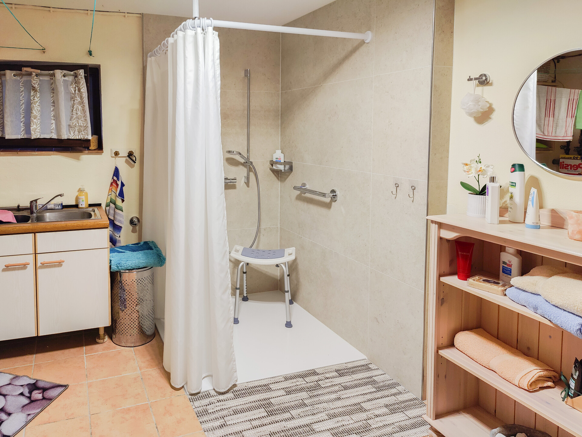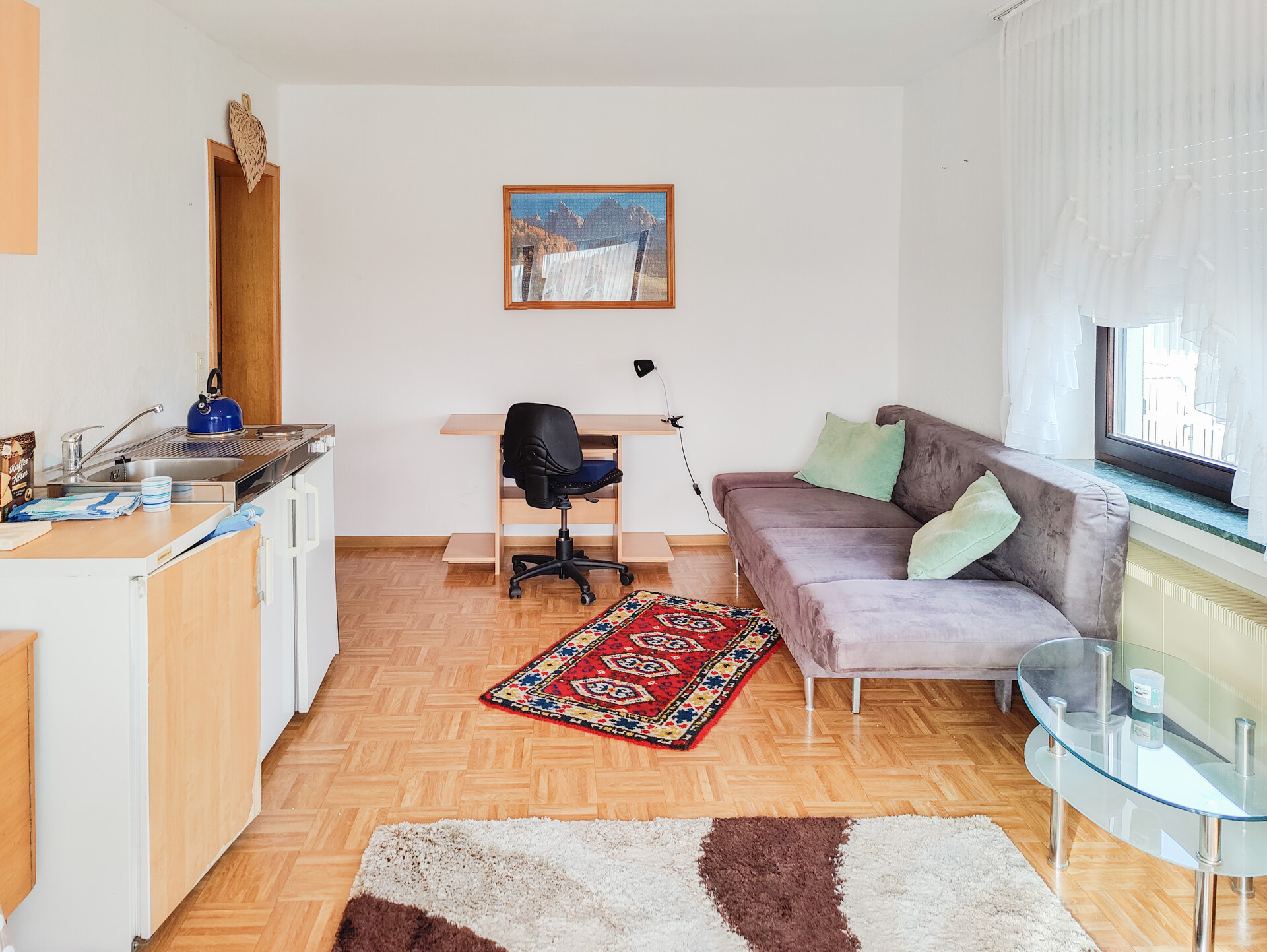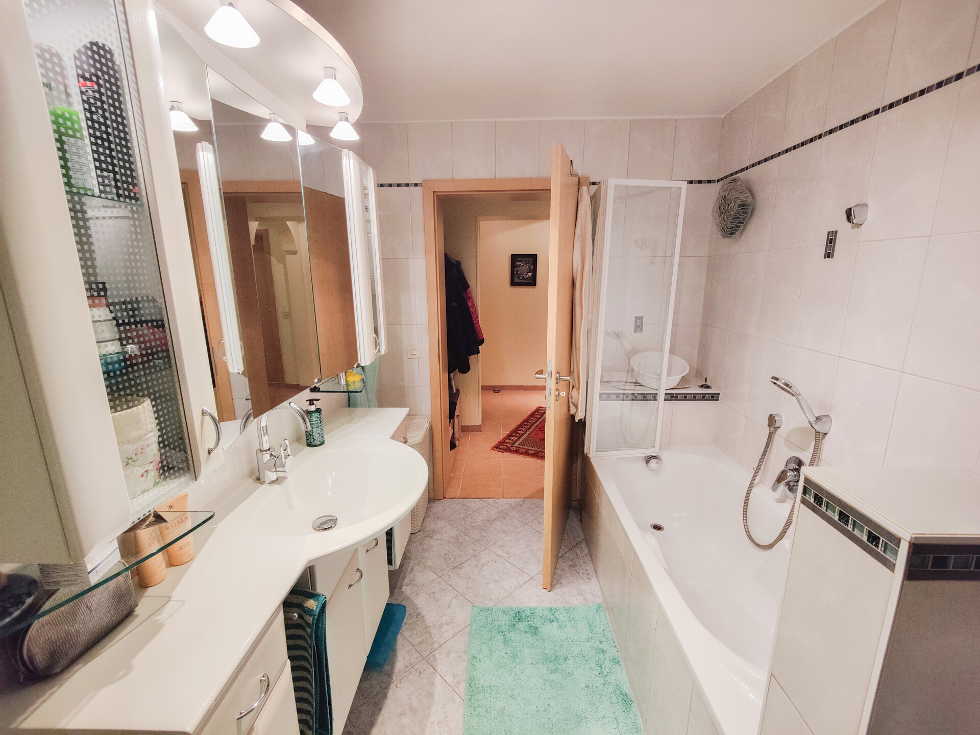 Auf den Böden befinden sich Teppich, Fliesen, PVC und Laminat.
