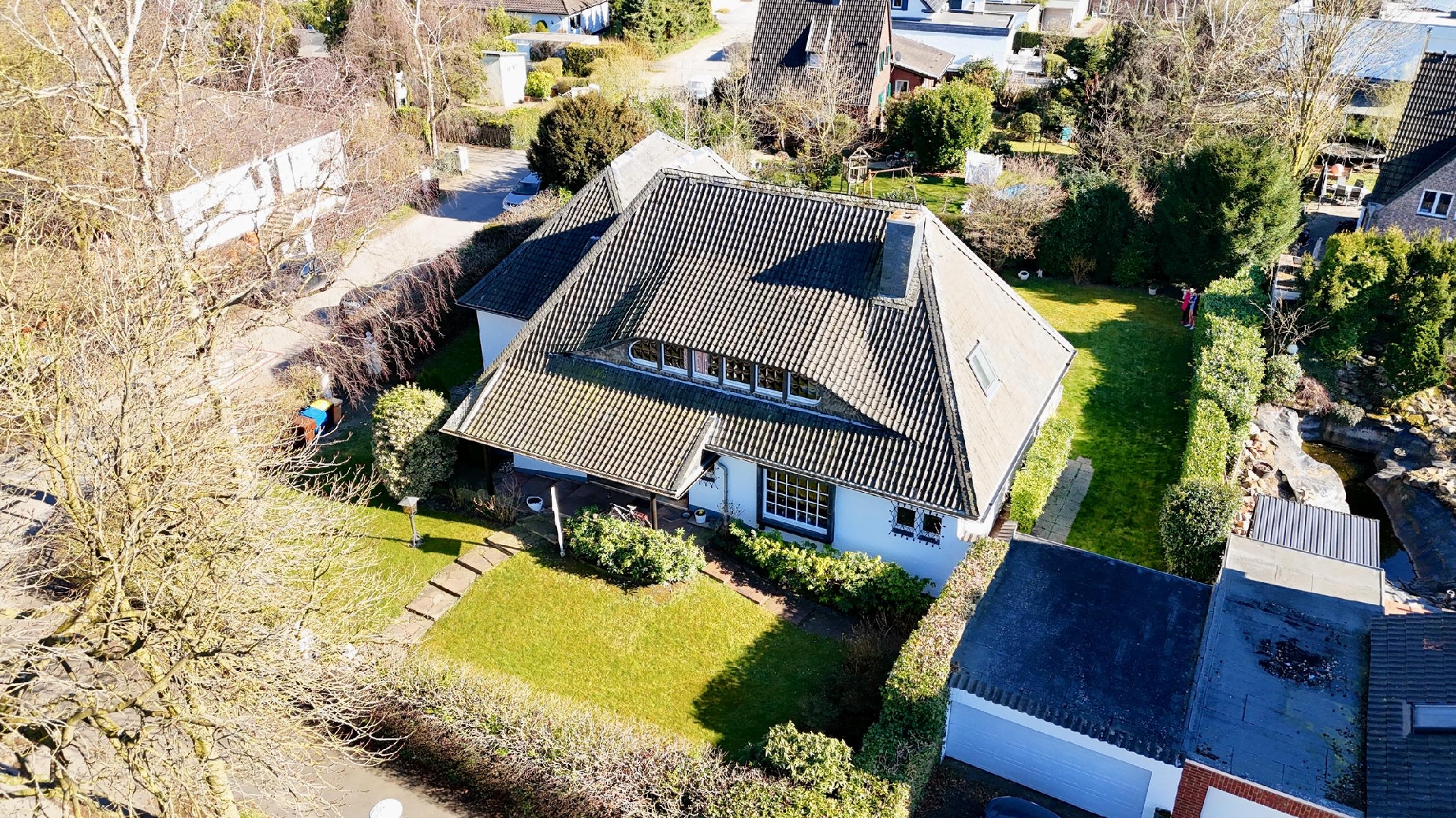 Das Anwesen ist voll eingefriedet und lässt keine Wünsche offen. Mittig des Grundstücks wurde um 1960 ein Bungalow errichtet, welcher 1966 / 1967 durch eine Aufstockung erweitert wurde. Etwa im Jahr 1974 wurde die Immobilie zusätzlich um ein Schwimmbad ergänzt. Heute erwartet Sie eine Villa mit rund 225 m² Wohnfläche sowie einer tageslichtdurchfluteten Schwimmhalle von ca. 113 m². Das Objekt ist voll unterkellert, verfügt über einen Dachboden und eine Doppelgarage.