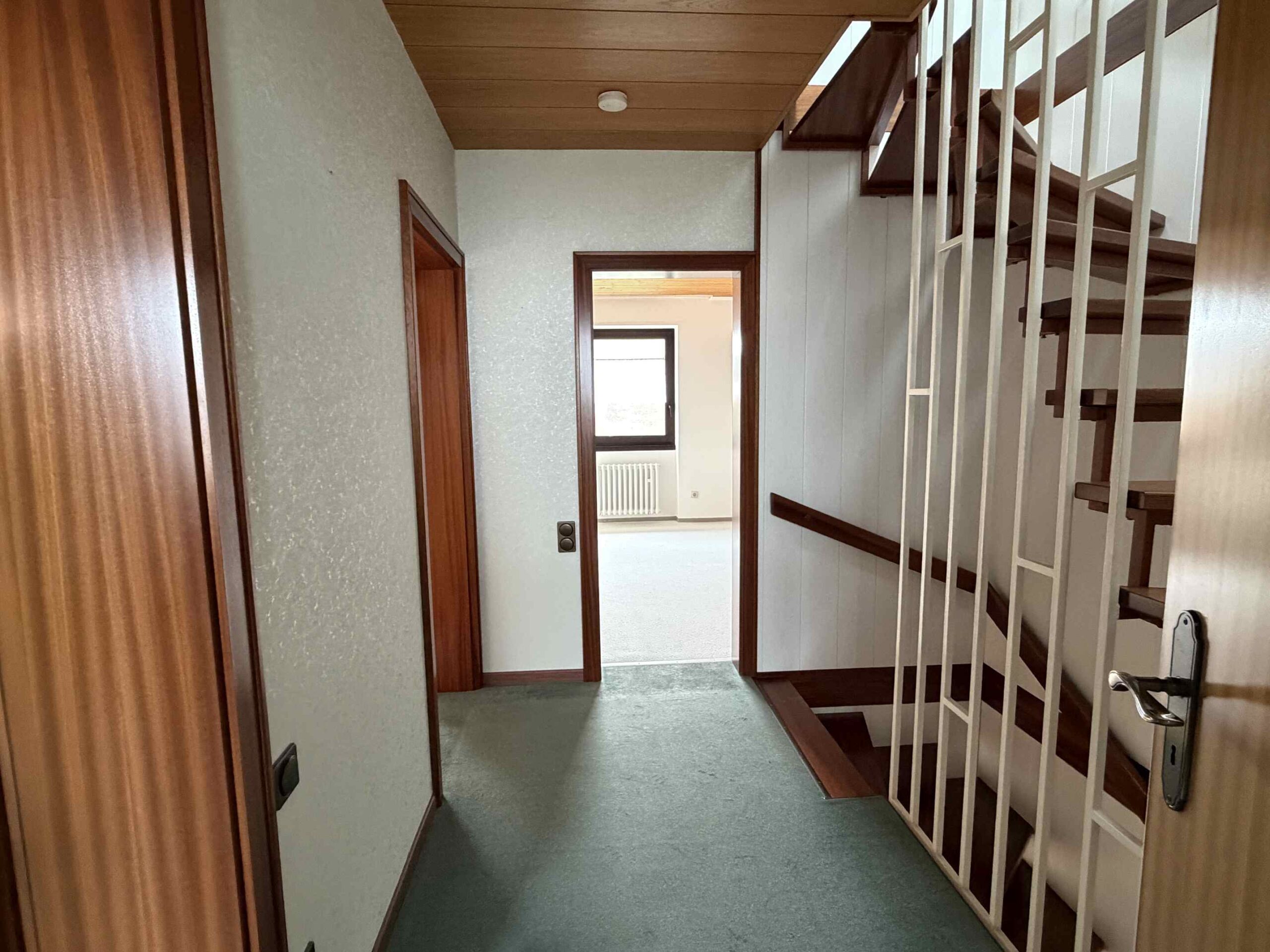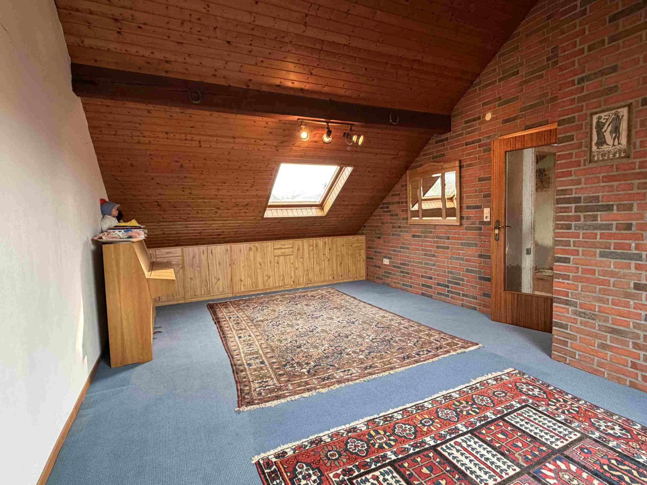 Offiziell 117 m² großes, zum linken Nachbarn versetzt angeordnetes Reihenhaus aus 1972, nachträglich wurde das Dachgeschoss mit einem großen Hobbyraum und einem kleinen Büro o.ä. in Eigenregie ausgebaut (ca. 28 m² Nutzfläche), nahezu perfekter Pflegezustand, neben dem großzügigen Wohnbereich stehen drei Schlafräume von 10, 16 und 19 m² Größe im OG zur Verfügung sowie das vorgenannte Dachstudio, welches wohnmäßig ausgebaut wurde.