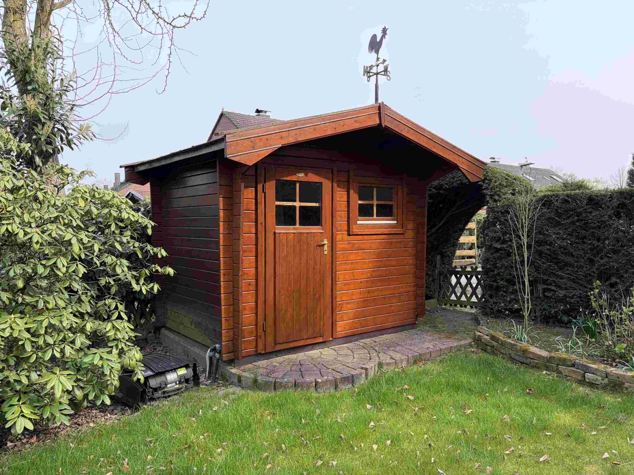 Im Garten sind die in Südlage ausgerichtete Terrasse mit elektrischer Markise, ein stabiles Gartenhaus sowie ein vorinstallierter Mähroboter erwähnenswert. Die Garage mit elektrischem Sektionaltor steht auf einer separaten Parzelle und liegt nur wenige Schritte vom Haus entfernt um die Ecke!